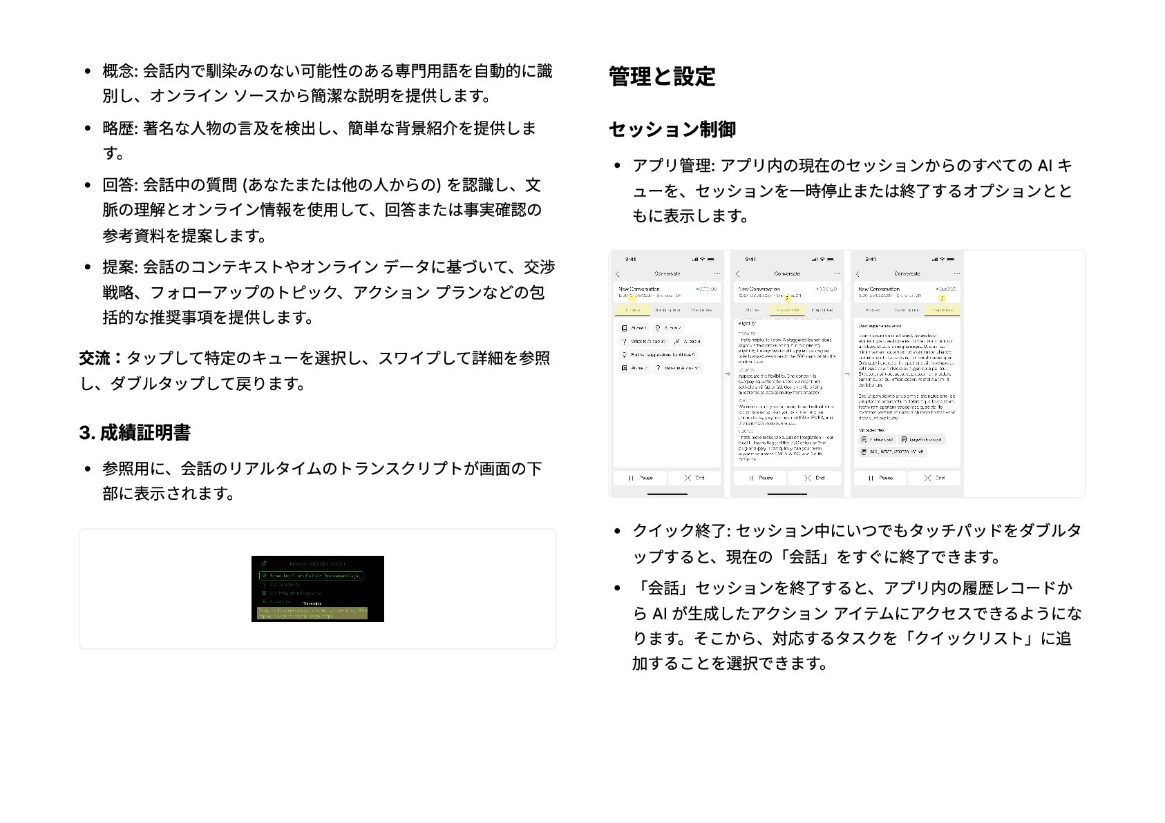 を認識し、文 脈の理解とオンライン情報を使用して、回答または事実確認の 参考資料を提案します。 提案: 会話のコンテキストやオンライン データに基づいて、交渉 戦略、フォローアップのトピック、アクション プランなどの包 括的な推奨事項を提供します。 交流:タップして特定のキューを選択し、スワイプして詳細を参照 し、ダブルタップして戻ります。 3. 成績証明書 参照用に、会話のリアルタイムのトランスクリプトが画面の下 部に表示されます。 管理と設定 セッション制御 アプリ管理: アプリ内の現在のセッションからのすべての AI キ ューを、セッションを一時停止または終了するオプションとと もに表示します。 クイック終了: セッション中にいつでもタッチパッドをダブルタ ップすると、現在の「会話」をすぐに終了できます。 「会話」セッションを終了すると、アプリ内の履歴レコードか ら AI が生成したアクション アイテムにアクセスできるようにな ります。そこから、対応するタスクを「クイックリスト」に追 加することを選択できます。