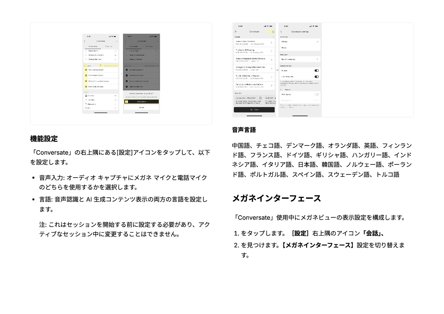 AI 生成コンテンツ表示の両方の言語を設定し ます。 注: これはセッションを開始する前に設定する必要があり、アク ティブなセッション中に変更することはできません。 音声言語 中国語、チェコ語、デンマーク語、オランダ語、英語、フィンラン ド語、フランス語、ドイツ語、ギリシャ語、ハンガリー語、インド ネシア語、イタリア語、日本語、韓国語、ノルウェー語、ポーラン ド語、ポルトガル語、スペイン語、スウェーデン語、トルコ語 メガネインターフェース 「Conversate」使用中にメガネビューの表示設定を構成します。 1. をタップします。[設定]右上隅のアイコン「会話」 、 2. を見つけます。 【メガネインターフェース】設定を切り替えま す。