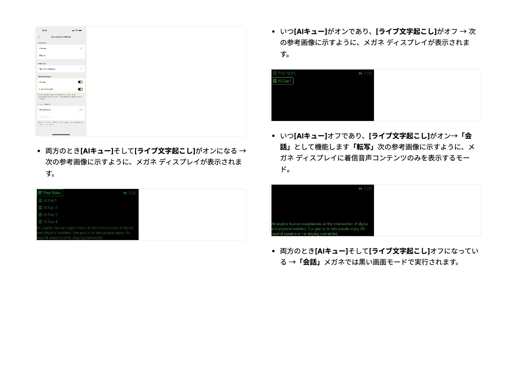 す。 いつ[AIキュー]オフであり、[ライブ文字起こし]がオン→「会 話」として機能します「転写」次の参考画像に示すように、メ ガネ ディスプレイに着信音声コンテンツのみを表示するモー ド。 両方のとき[AIキュー]そして[ライブ文字起こし]オフになってい る →「会話」メガネでは黒い画面モードで実行されます。