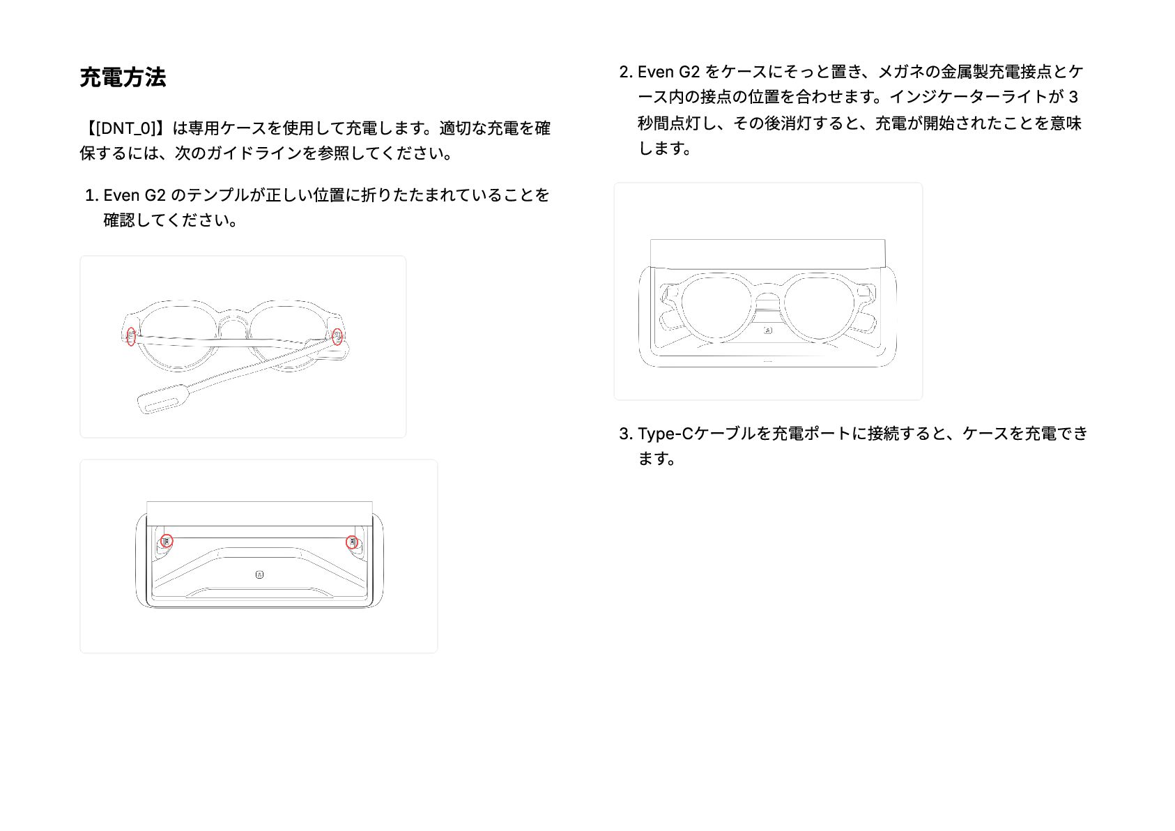 2. 充電方法 【[DNT_0]】は専用ケースを使用して充電します。適切な充電を確 保するには、次のガイドラインを参照してください。 1. Even G2 のテンプルが正しい位置に折りたたまれていることを 確認してください。 2. Even