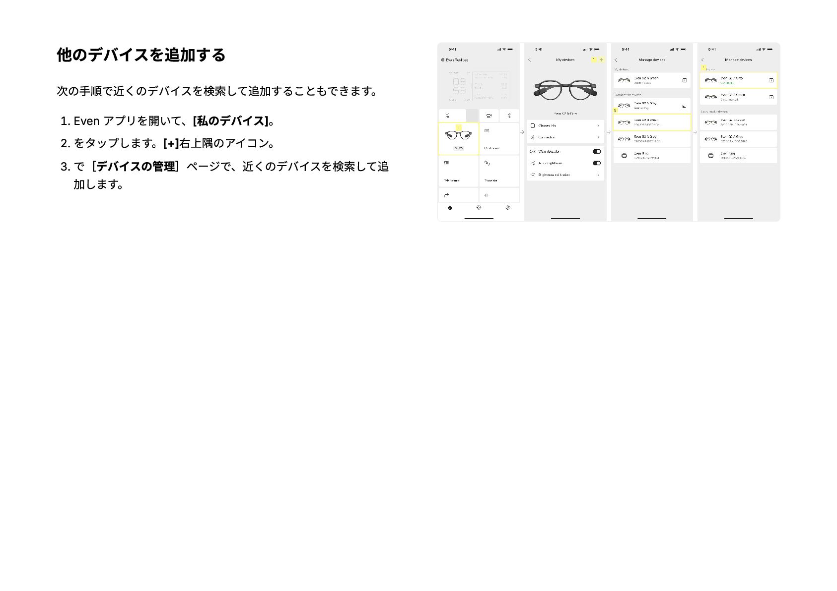 3. PDF_MARKER_2_ ペアリング方法 Even Realities アプリをダウンロード 初めて Even アプリを使用してデバイスを接続するとき、アプリは参照して 従うためのステップバイステップのガイドを提供します。 Even