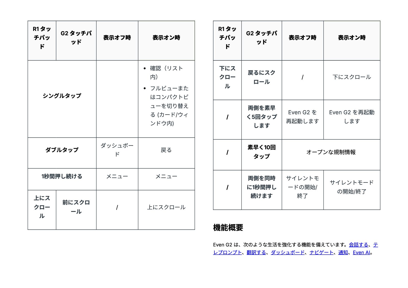 確認(リスト 内) フルビューまた はコンパクトビ ューを切り替え る (カード/ウィ ンドウ内) ダブルタップ ダッシュボー ド 戻る 1秒間押し続ける メニュー メニュー 上にス クロー ル 前にスクロ ール / 上にスクロール R1 タッ チパッ ド G2 タッチパ ッド 表示オフ時 表示オン時 下にス クロー ル 戻るにスク ロール / 下にスクロール / 両側を素早 く5回タップ します Even G2 を 再起動します Even G2 を再起動 します / 素早く10回 タップ オープンな規制情報 / 両側を同時 に1秒間押し 続けます サイレントモ ードの開始/ 終了 サイレントモード の開始/終了 機能概要 Even G2 は、次のような生活を強化する機能を備えています。会話する、テ レプロンプト、翻訳する、ダッシュボード、ナビゲート、通知、Even AI。