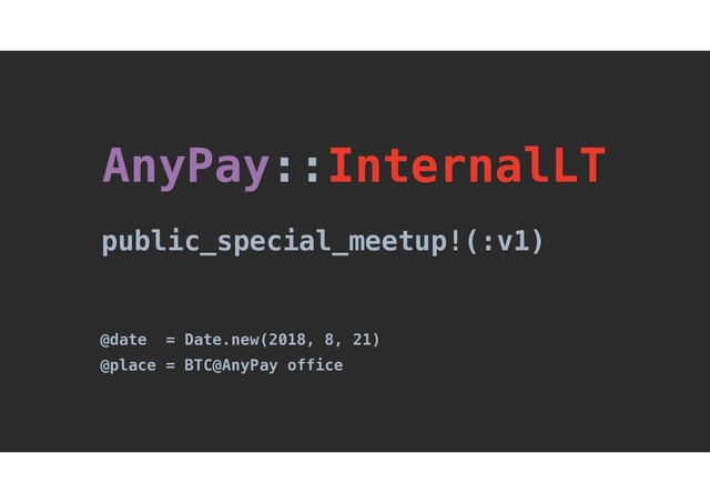 AnyPay::InternalLT public_special_meetup!(:v1) @date = Date.new(2018, 8, 21) @place = BTC@AnyPay