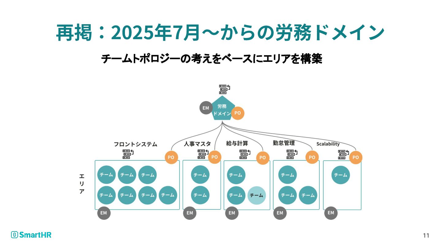 SmartHR最大のプロダクト部門である労務ドメインは、16チーム・5エリアへと急拡大する中で、「チーム間の連携不足」や「機能開発と技術的負債解消のバランス」といった成長痛に直面しました。これらを解決し、人的資本プラットフォームとしての進化を加速させるため、半年前に「Scrum@Scale(S@S)」を導入しました。