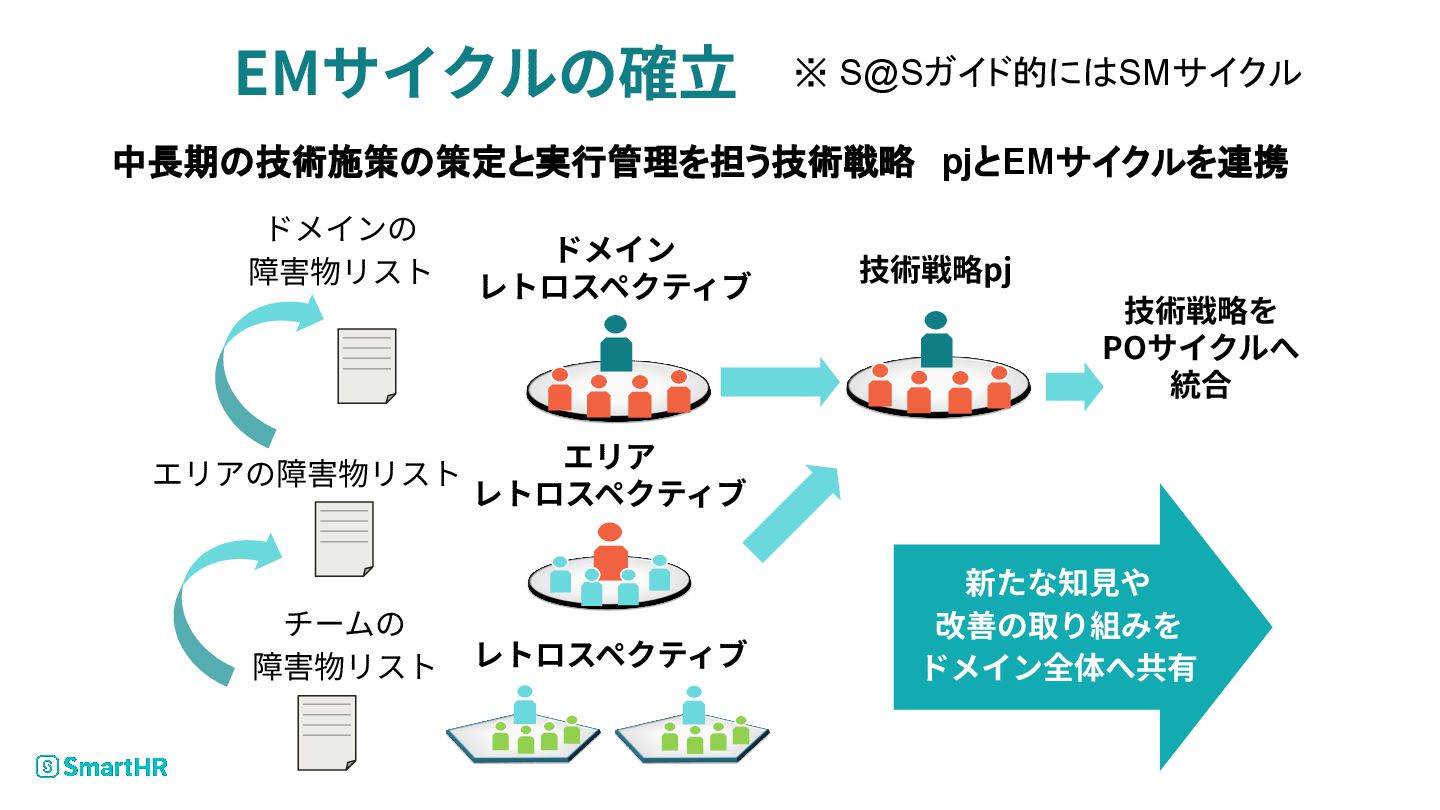 レトロスペクティブ 新たな知⾒や 改善の取り組みを ドメイン全体へ共有 技術戦略pj 技術戦略を POサイクルへ 統合 中長期の技術施策の策定と実行管理を担う技術戦略 pjとEMサイクルを連携 ※ S@Sガイド的にはSMサイクル