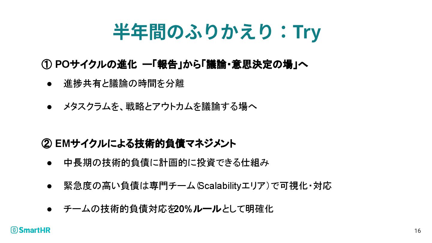 EMサイクルによる技術的負債マネジメント • 中長期の技術的負債に計画的に投資できる仕組み • 緊急度の高い負債は専門チーム( Scalabilityエリア)で可視化・対応 • チームの技術的負債対応を20%ルールとして明確化