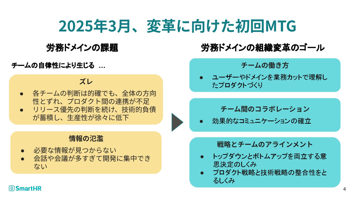 1. 4 2025年3⽉、変⾰に向けた初回MTG 労務ドメインの課題 ズレ • 各チームの判断は的確でも、全体の⽅向 性とずれ、プロダクト間の連携が不⾜ • リリース優先の判断を続け、技術的負債 が蓄積し、⽣産性が徐々に低下