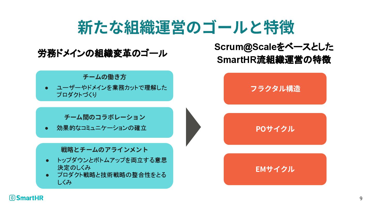 チーム間のコラボレーション • 効果的なコミュニケーションの確立 戦略とチームのアラインメント • トップダウンとボトムアップを両立する意思 決定のしくみ • プロダクト戦略と技術戦略の整合性をとる しくみ Scrum@Scaleをベースとした SmartHR流組織運営の特徴