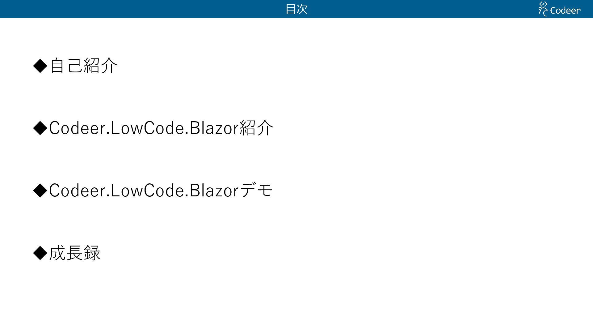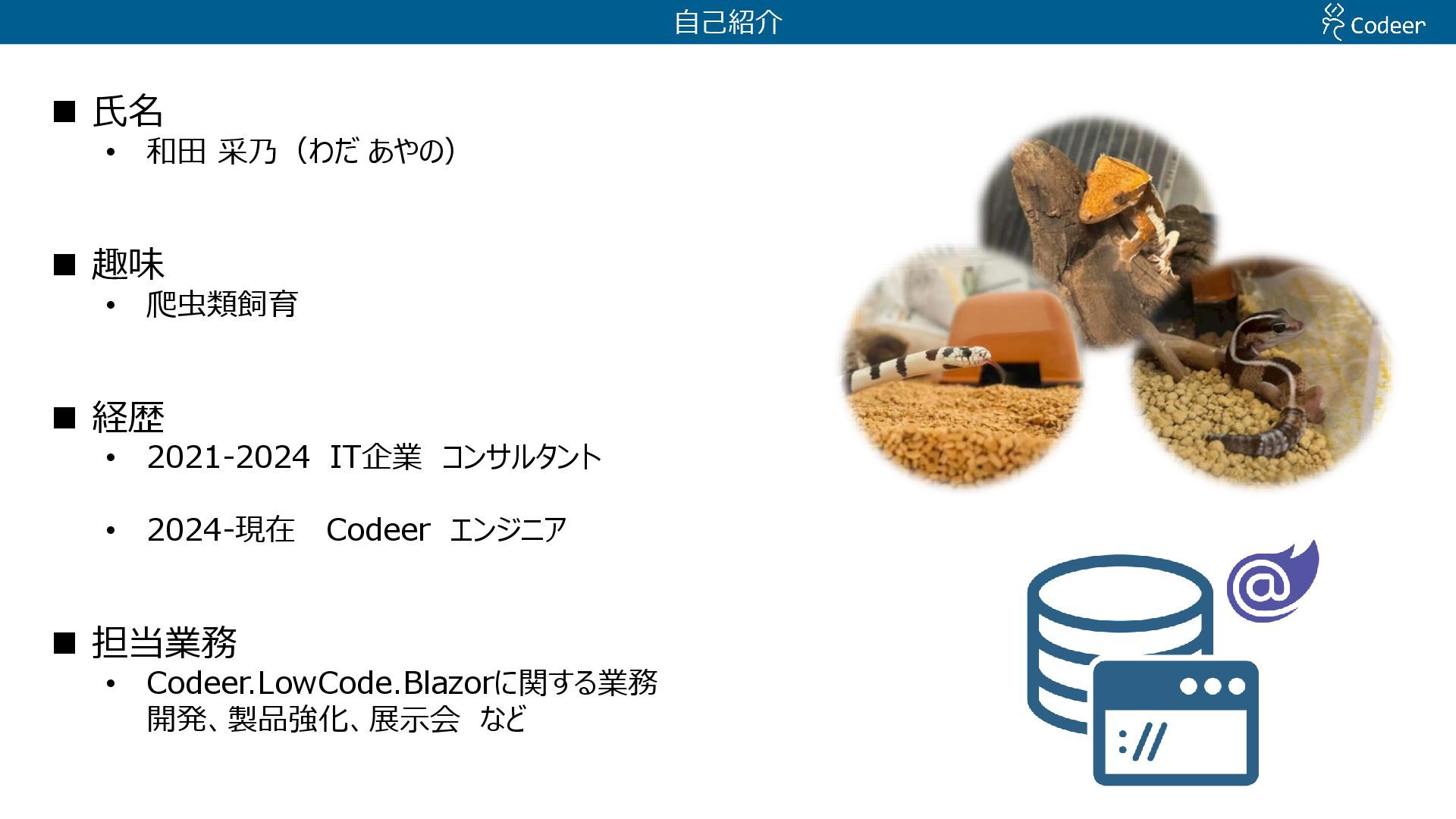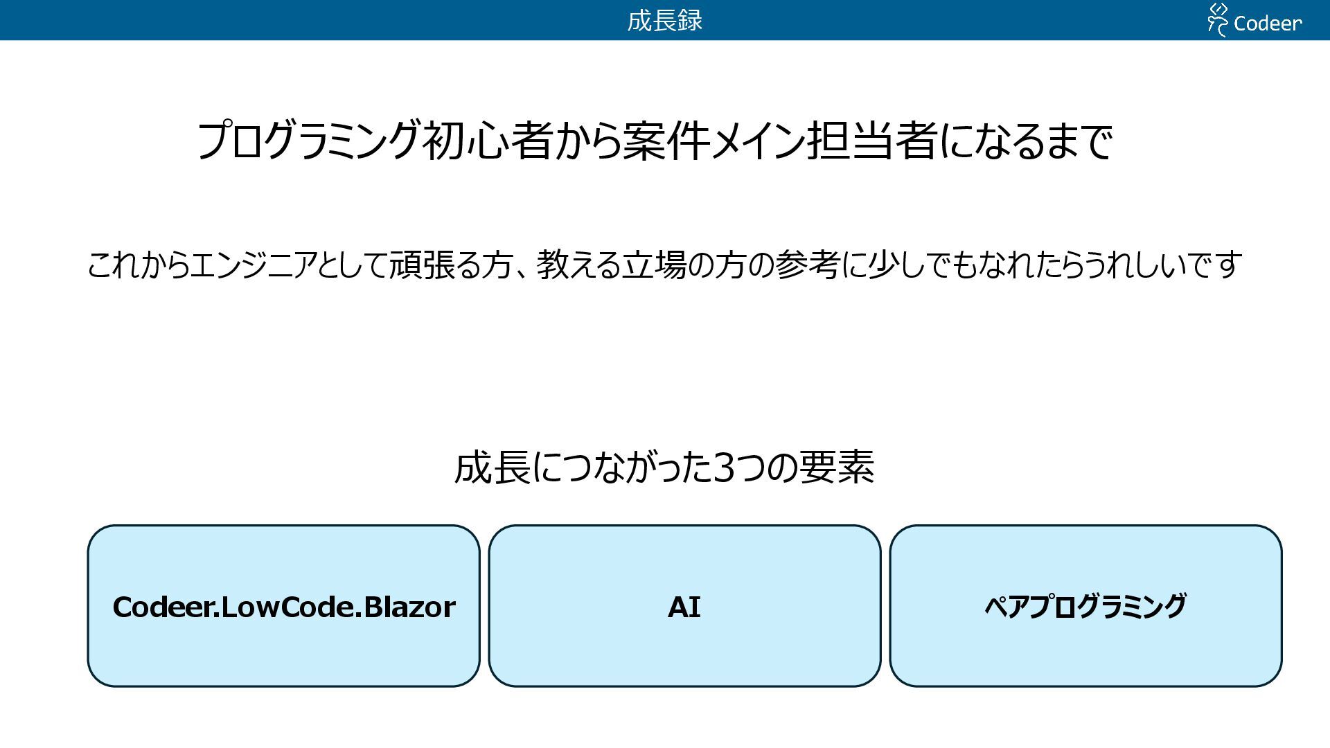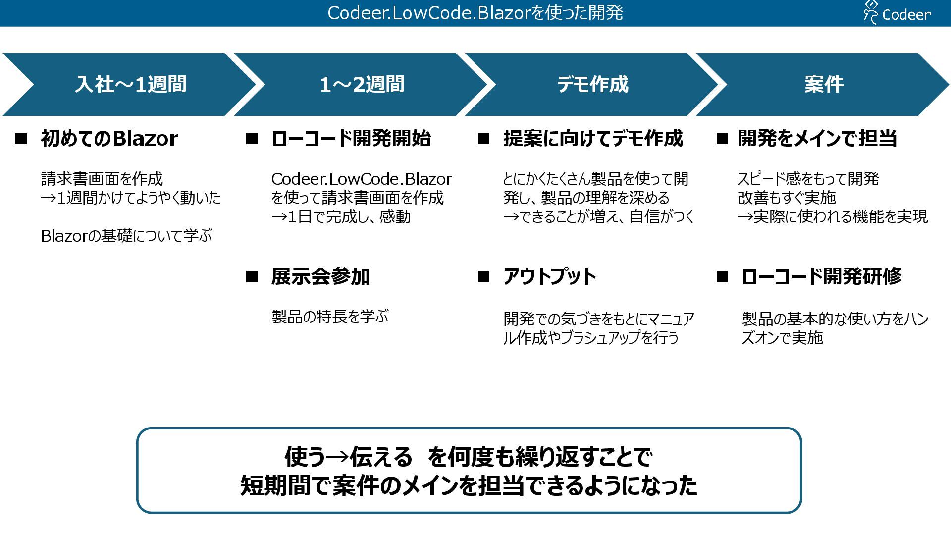 ◼ ローコード開発開始 Codeer.LowCode.Blazor を使って請求書画面を作成 →1日で完成し、感動 ◼ 展示会参加 製品の特長を学ぶ ◼ 提案に向けてデモ作成 とにかくたくさん製品を使って開 発し、製品の理解を深める →できることが増え、自信がつく ◼ アウトプット 開発での気づきをもとにマニュア ル作成やブラシュアップを行う ◼ 開発をメインで担当 スピード感をもって開発 改善もすぐ実施 →実際に使われる機能を実現 ◼ ローコード開発研修 製品の基本的な使い方をハン ズオンで実施 使う→伝える を何度も繰り返すことで 短期間で案件のメインを担当できるようになった