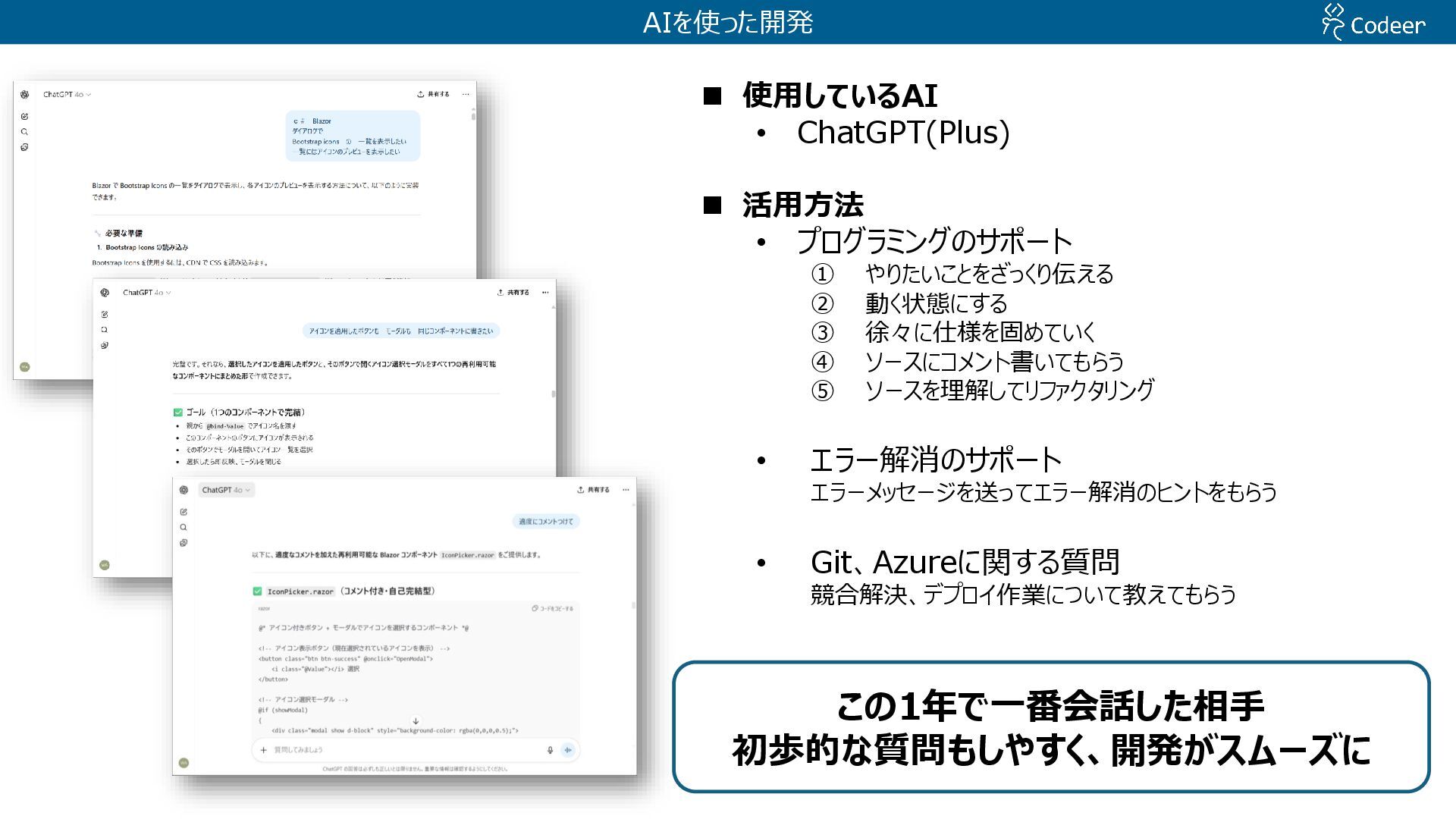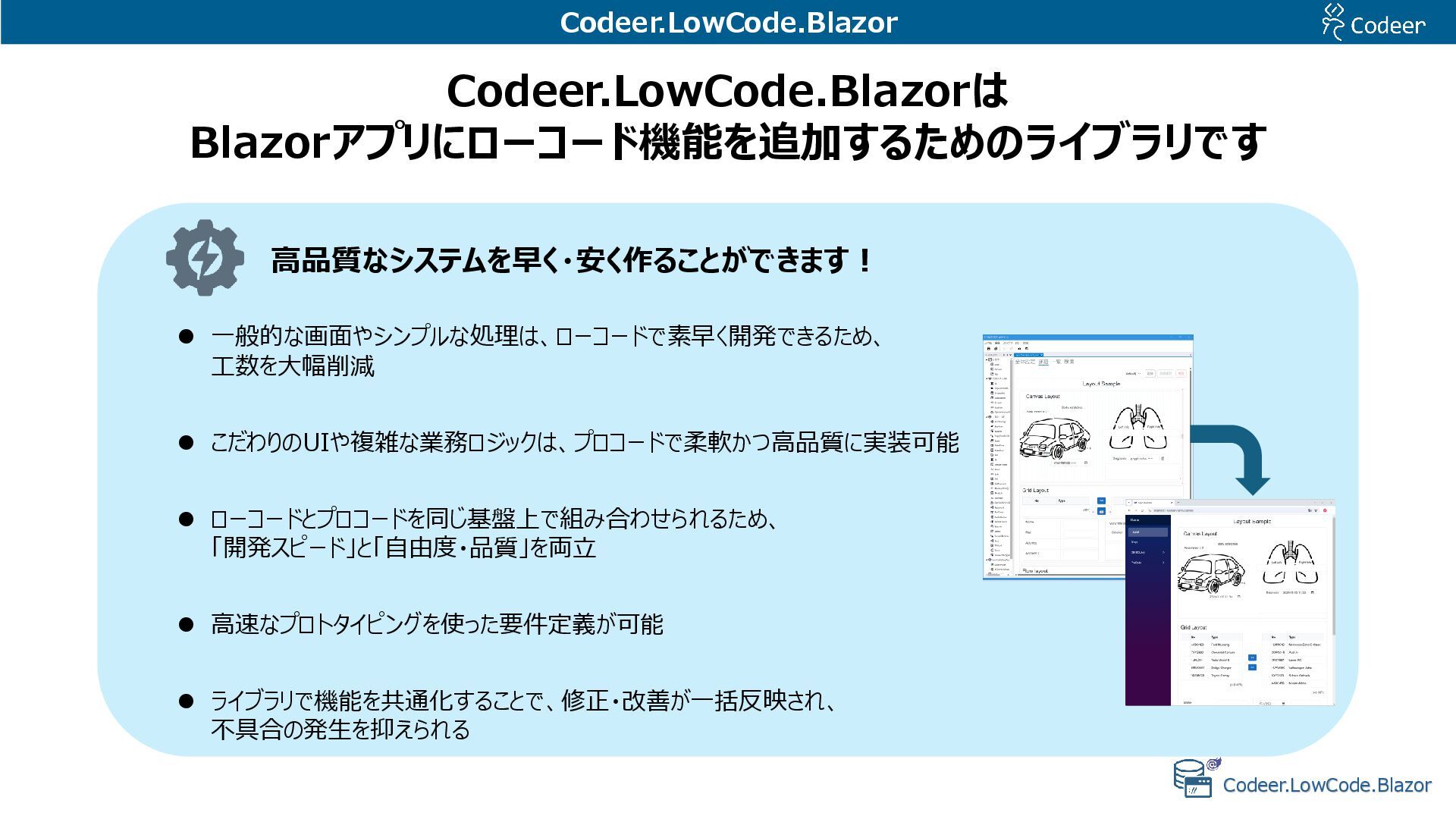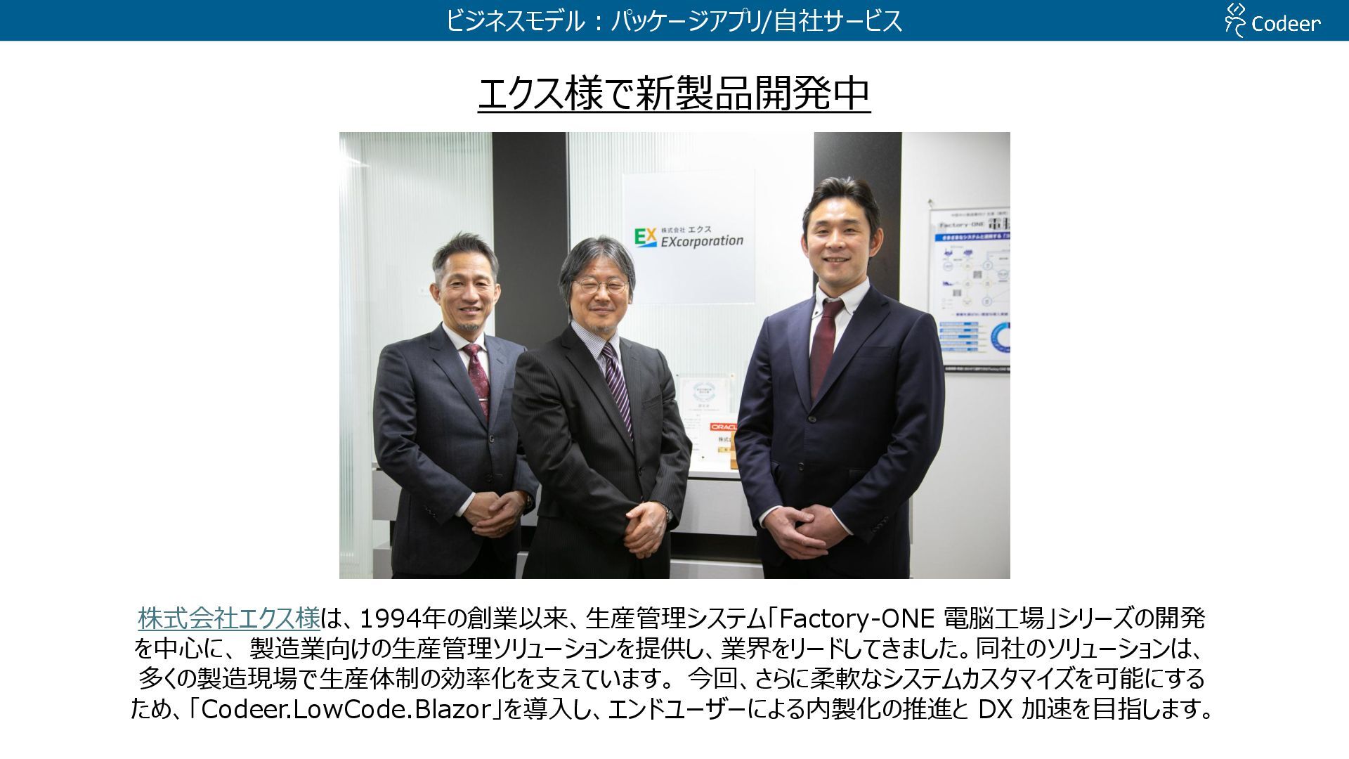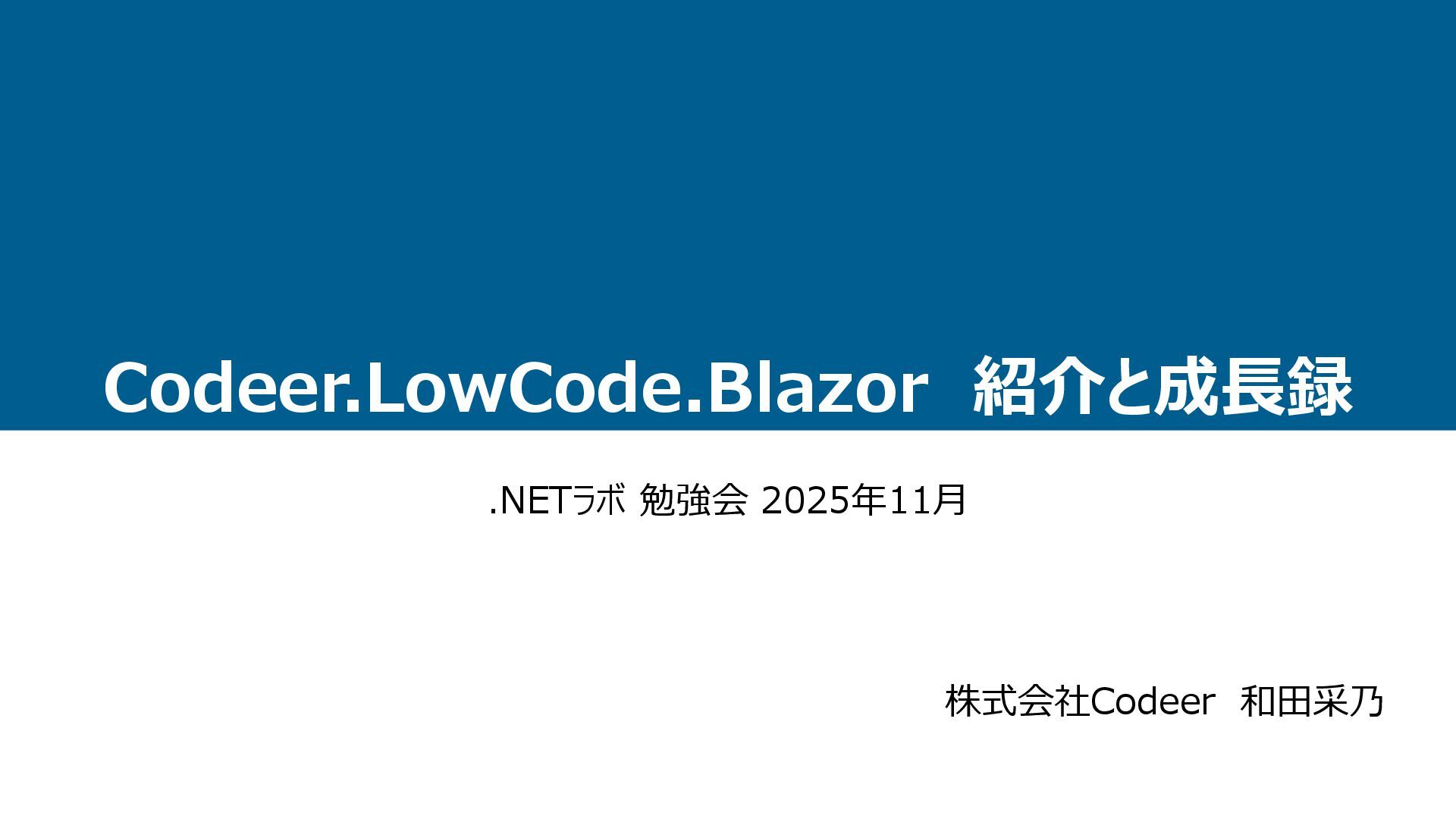 ◼ ローコード開発開始 Codeer.LowCode.Blazor を使って請求書画面を作成 →1日で完成し、感動 ◼ 展示会参加 製品の特長を学ぶ ◼ 提案に向けてデモ作成 とにかくたくさん製品を使って開 発し、製品の理解を深める →できることが増え、自信がつく ◼ アウトプット 開発での気づきをもとにマニュア ル作成やブラシュアップを行う ◼ 開発をメインで担当 スピード感をもって開発 改善もすぐ実施 →実際に使われる機能を実現 ◼ ローコード開発研修 製品の基本的な使い方をハン ズオンで実施 使う→伝える を何度も繰り返すことで 短期間で案件のメインを担当できるようになった
