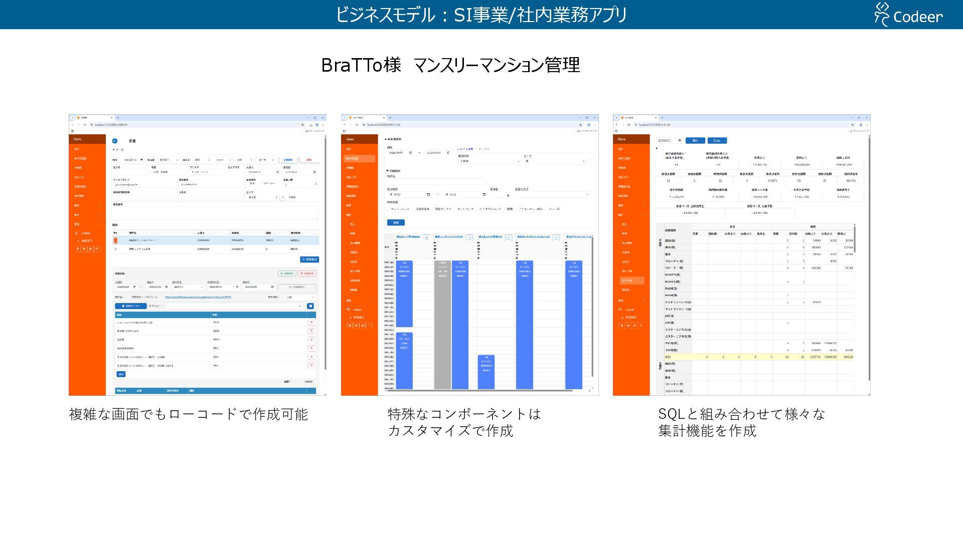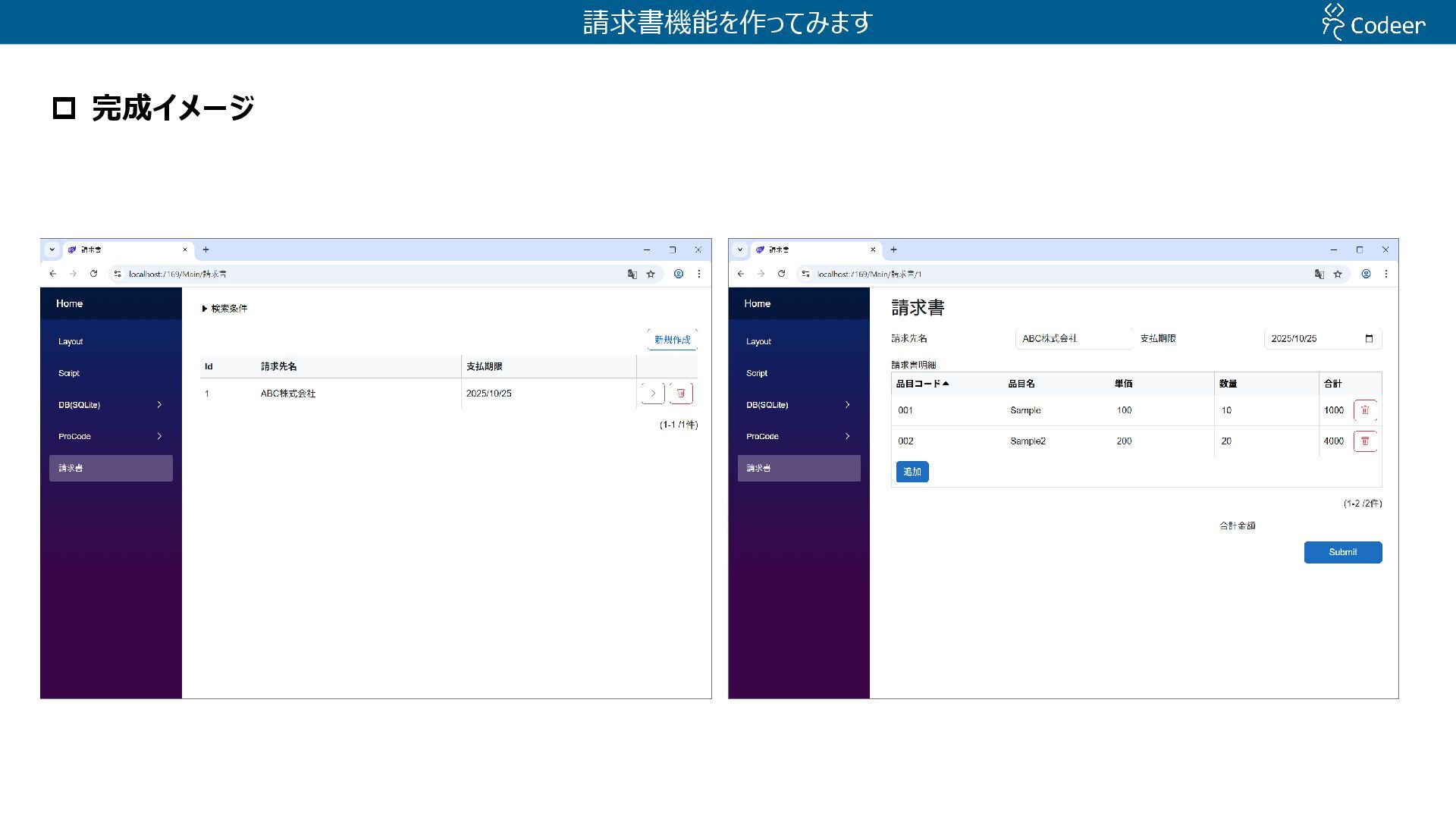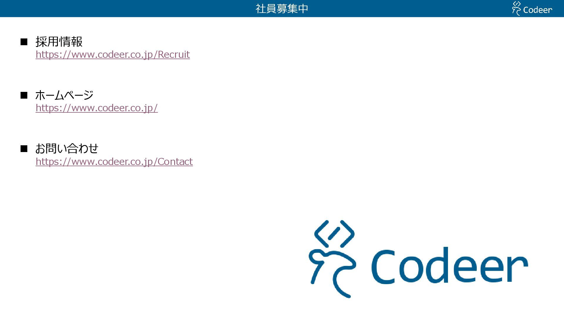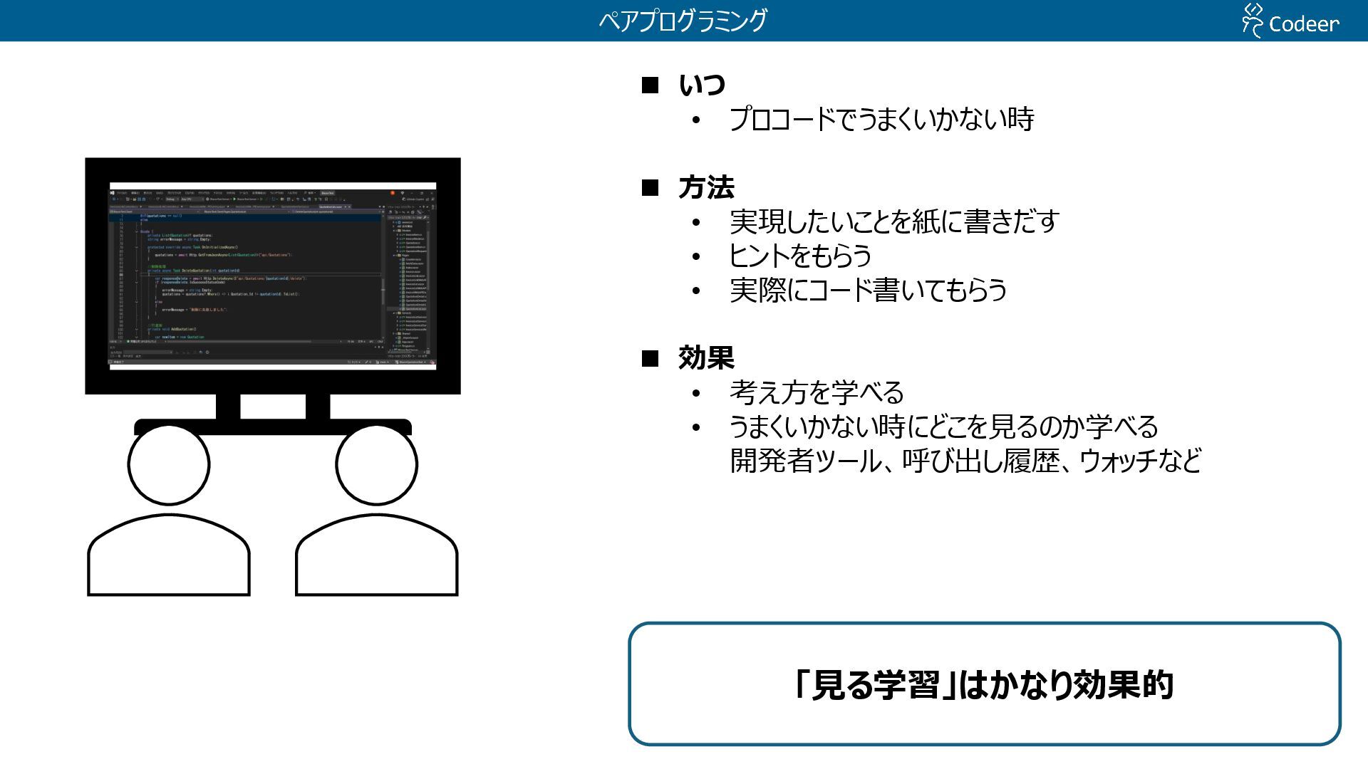 ◼ ローコード開発開始 Codeer.LowCode.Blazor を使って請求書画面を作成 →1日で完成し、感動 ◼ 展示会参加 製品の特長を学ぶ ◼ 提案に向けてデモ作成 とにかくたくさん製品を使って開 発し、製品の理解を深める →できることが増え、自信がつく ◼ アウトプット 開発での気づきをもとにマニュア ル作成やブラシュアップを行う ◼ 開発をメインで担当 スピード感をもって開発 改善もすぐ実施 →実際に使われる機能を実現 ◼ ローコード開発研修 製品の基本的な使い方をハン ズオンで実施 使う→伝える を何度も繰り返すことで 短期間で案件のメインを担当できるようになった