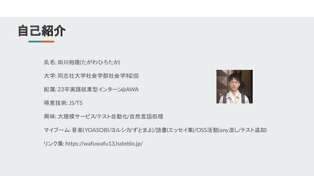 自己紹介 氏名: 田川裕隆(たがわひろたか) 大学: 同志社大学社会学部社会学科 2回 配属: 23卒実践就業型インターン@AWA 得意技術: JS/TS