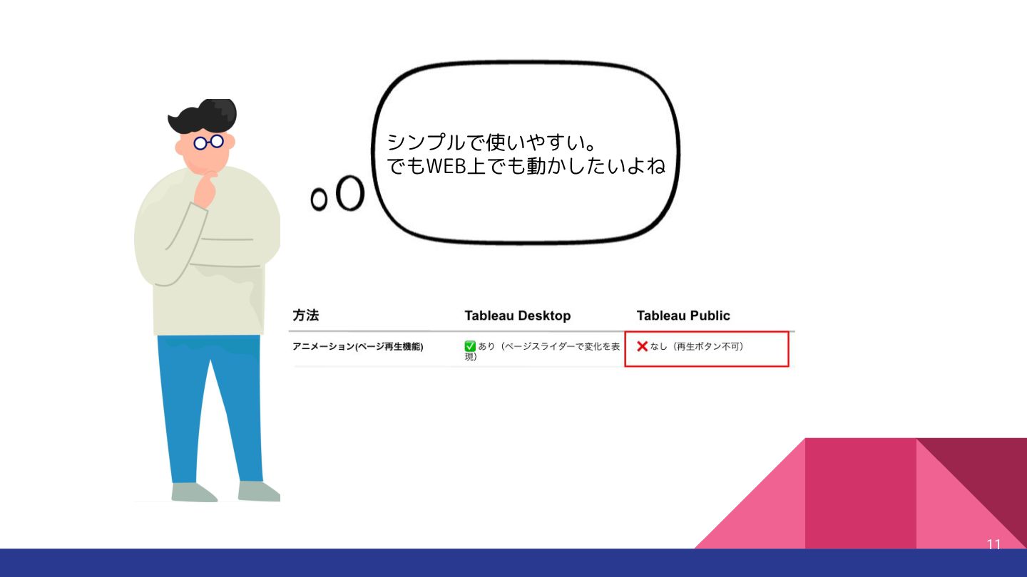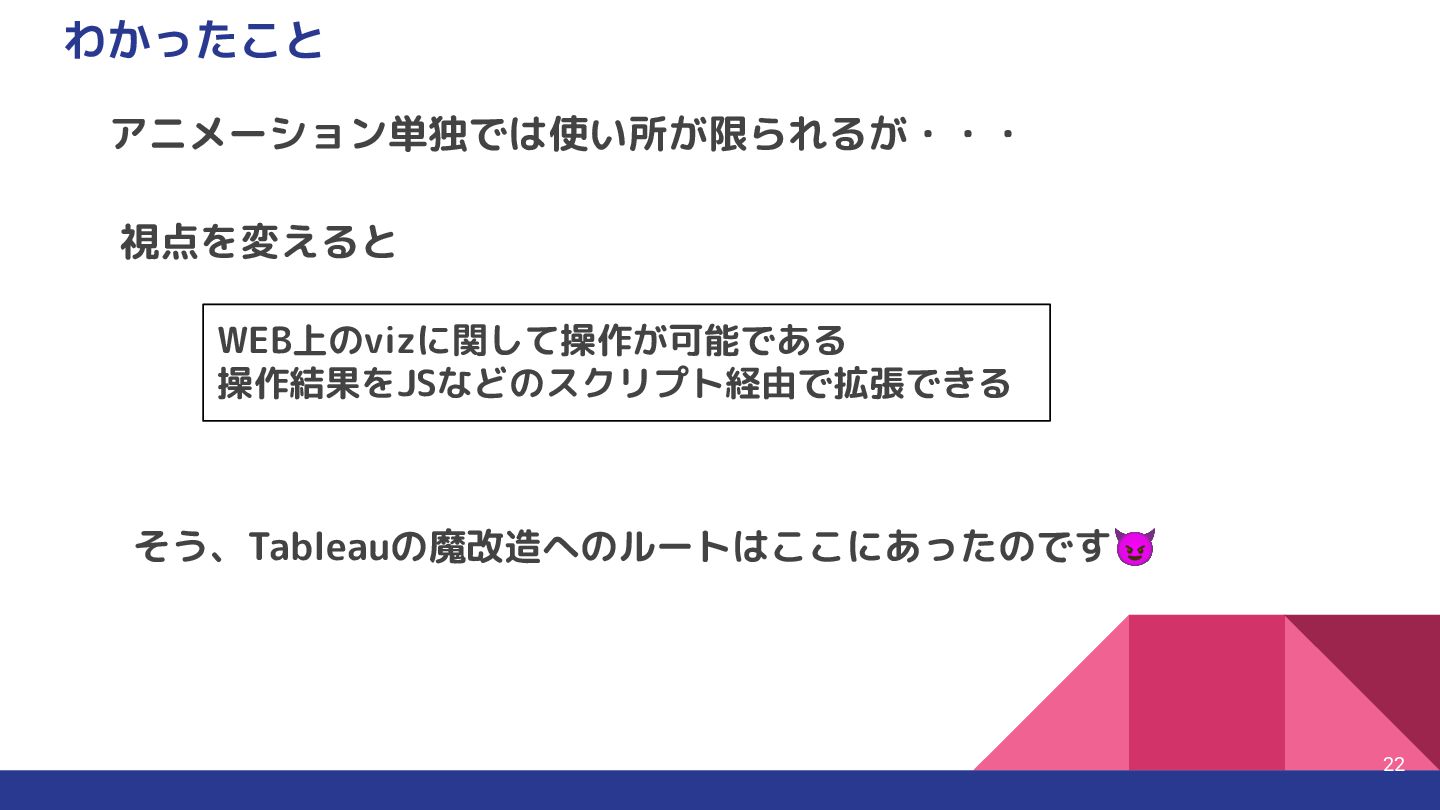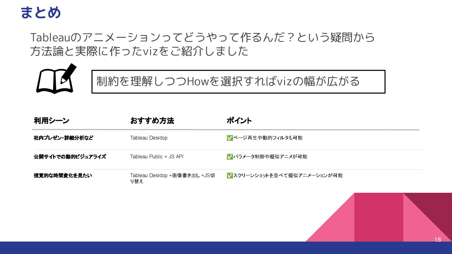 Tableau Desktop +画像書き出し +JS切 り替え 利用シーン 社内プレゼン・詳細分析など 公開サイトでの動的ビジュアライズ 視覚的な時間変化を見たい ポイント ✅ページ再生や動的フィルタも可能 ✅パラメータ制御や擬似アニメが可能 ✅スクリーンショットを並べて擬似アニメーションが可能 Tableauのアニメーションってどうやって作るんだ?という疑問から 方法論と実際に作ったvizをご紹介しました 制約を理解しつつHowを選択すればvizの幅が広がる