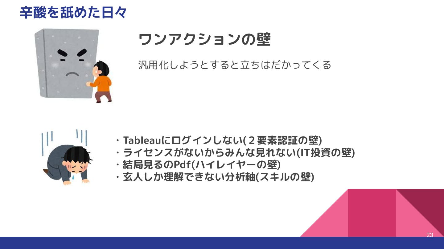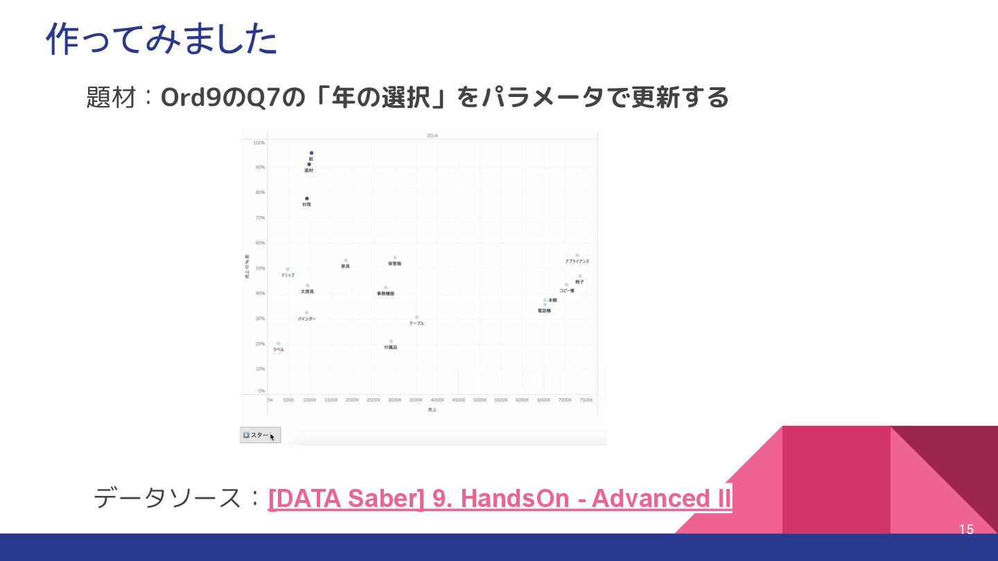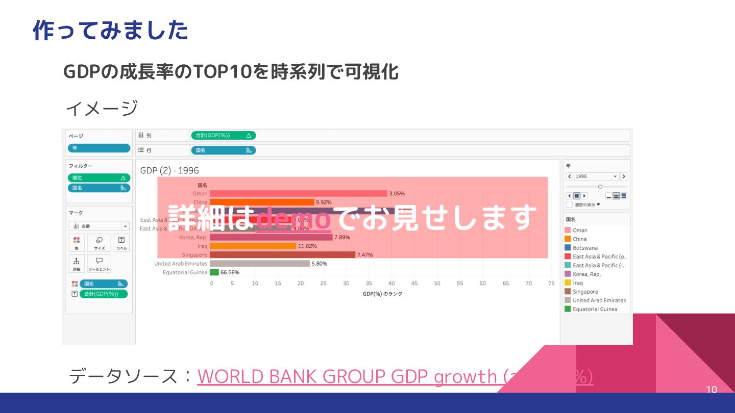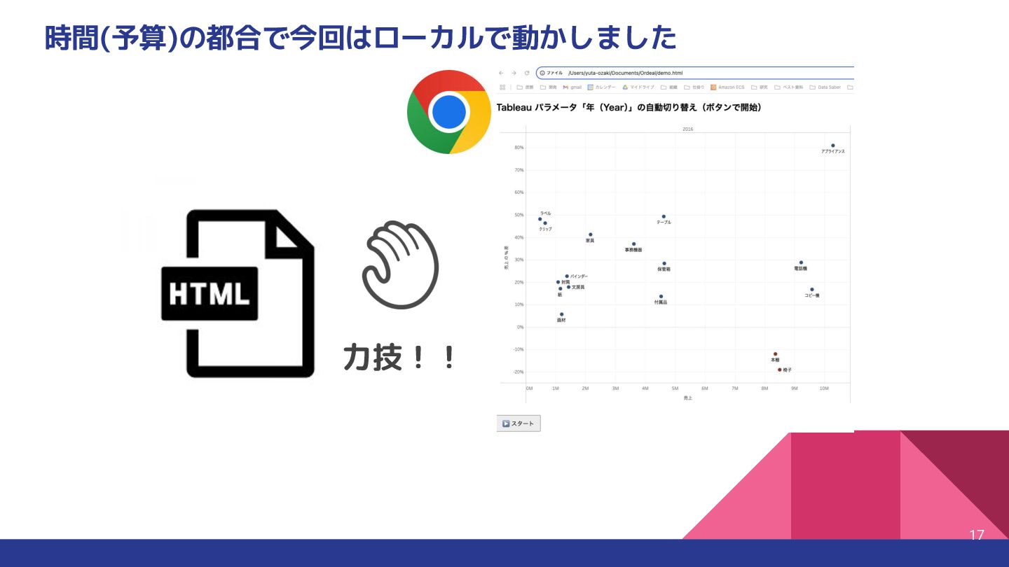 Tableau Desktop +画像書き出し +JS切 り替え 利用シーン 社内プレゼン・詳細分析など 公開サイトでの動的ビジュアライズ 視覚的な時間変化を見たい ポイント ✅ページ再生や動的フィルタも可能 ✅パラメータ制御や擬似アニメが可能 ✅スクリーンショットを並べて擬似アニメーションが可能 Tableauのアニメーションってどうやって作るんだ?という疑問から 方法論と実際に作ったvizをご紹介しました 制約を理解しつつHowを選択すればvizの幅が広がる