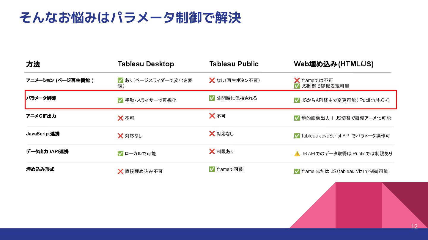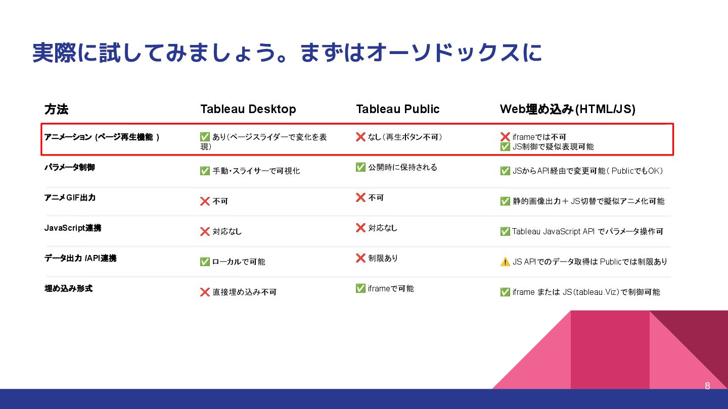 不可 ❌ 対応なし ✅ ローカルで可能 ❌ 直接埋め込み不可 方法 アニメーション (ページ再生機能 ) パラメータ制御 アニメ GIF出力 JavaScript連携 データ出力 /API連携 埋め込み形式 Tableau Public ❌ なし(再生ボタン不可) ✅ 公開時に保持される ❌ 不可 ❌ 対応なし ❌ 制限あり ✅ iframeで可能 Web埋め込み(HTML/JS) ❌ iframeでは不可 ✅ JS制御で疑似表現可能 ✅ JSからAPI経由で変更可能( PublicでもOK) ✅ 静的画像出力+ JS切替で擬似アニメ化可能 ✅ Tableau JavaScript API でパラメータ操作可 ⚠ JS APIでのデータ取得は Publicでは制限あり ✅ iframe または JS(tableau.Viz)で制御可能