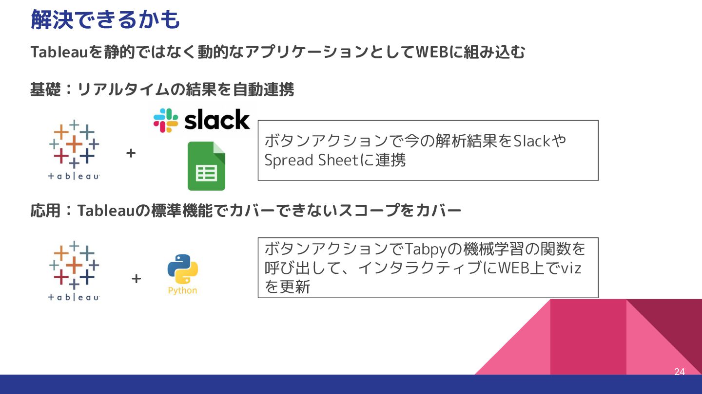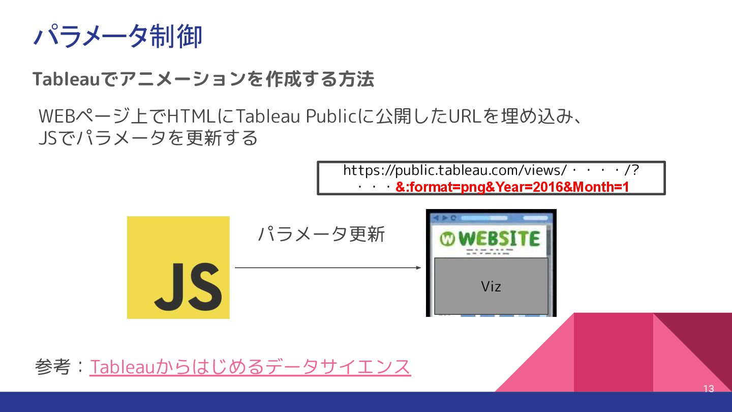 4. そんなお悩みはパラメータ制御で解決 12 Tableau Desktop ✅ あり(ページスライダーで変化を表 現) ✅ 手動・スライサーで可視化 ❌