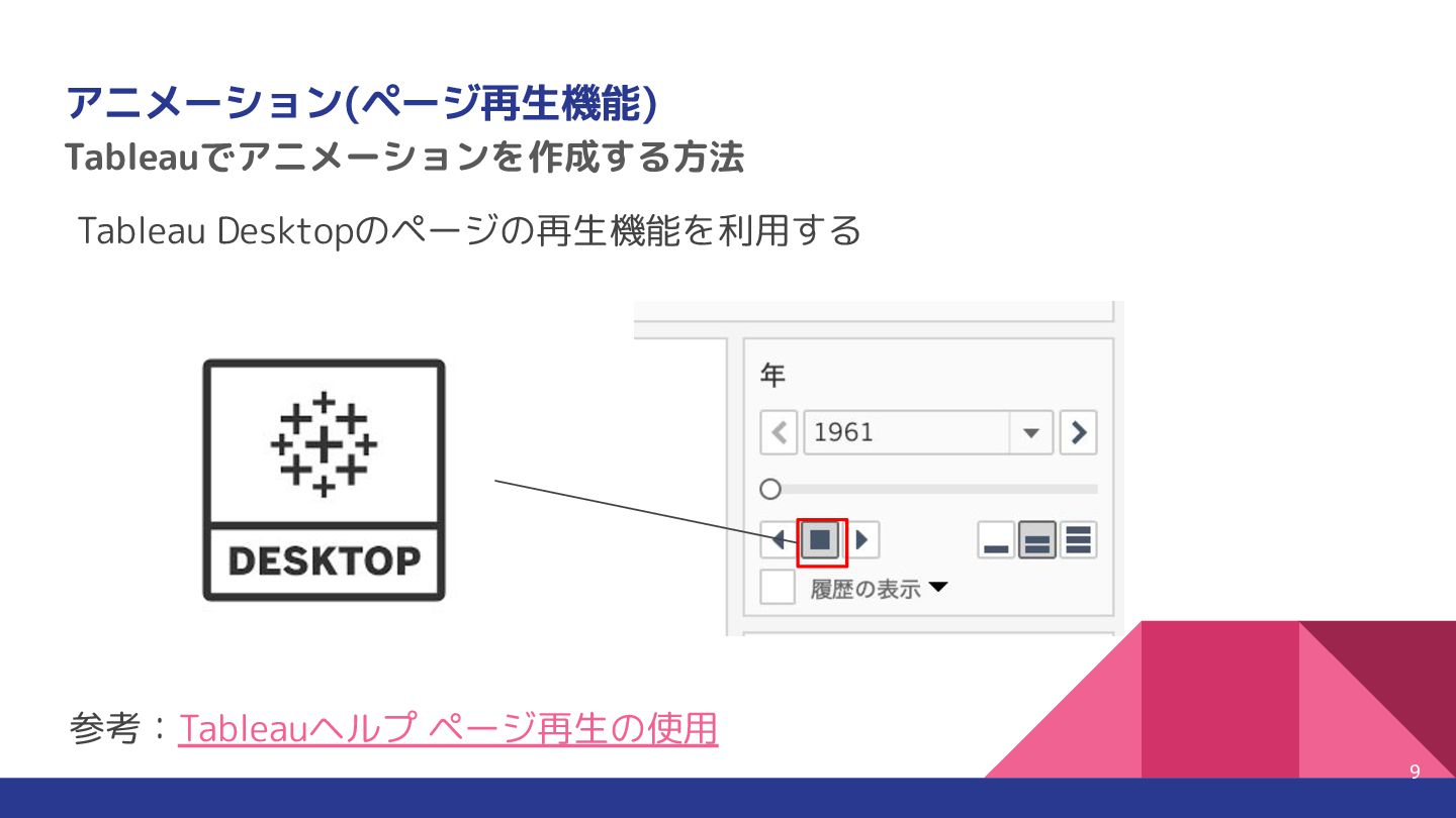 3. 実際に試してみましょう。まずはオーソドックスに 8 Tableau Desktop ✅ あり(ページスライダーで変化を表 現) ✅ 手動・スライサーで可視化 ❌