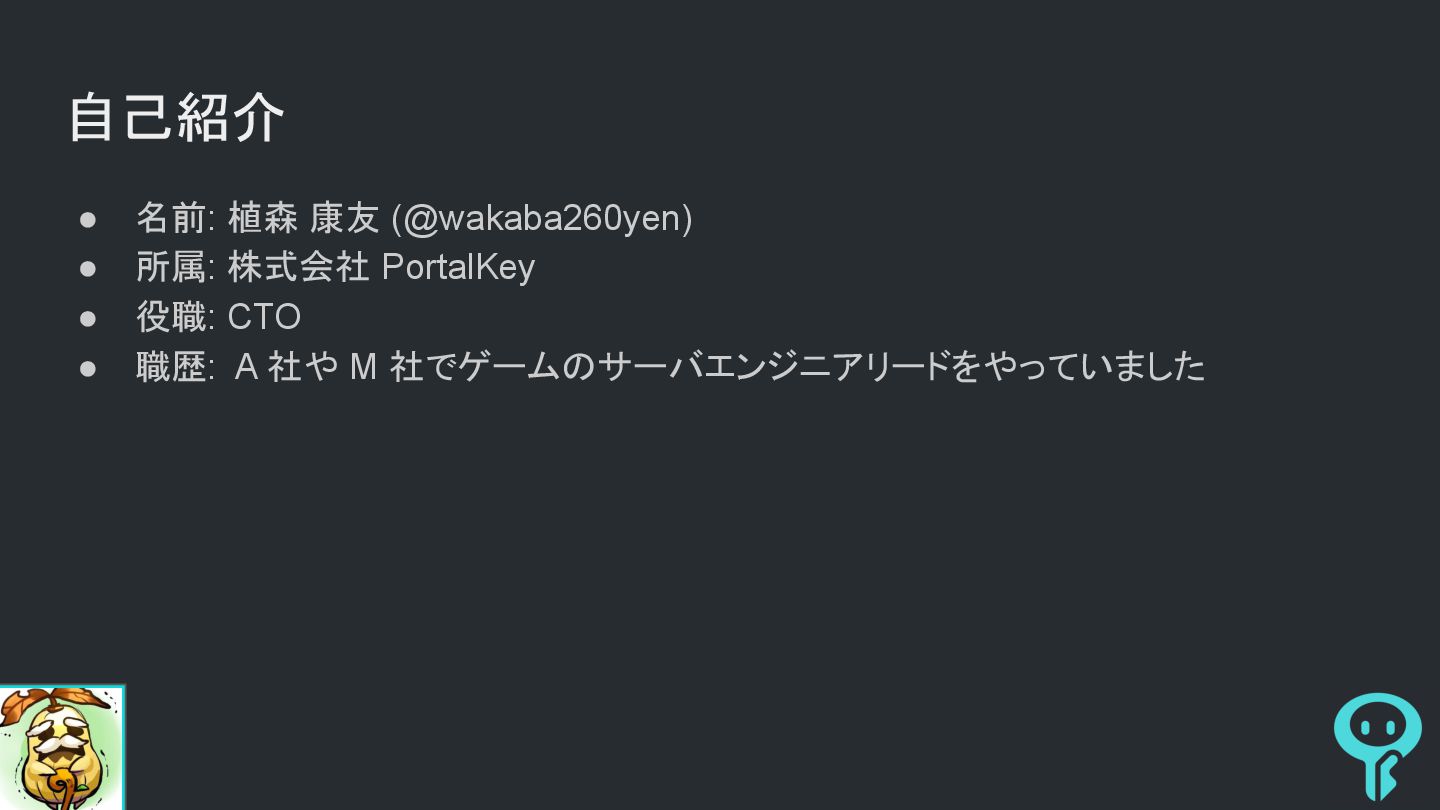 自己紹介 • 名前: 植森 康友 (@wakaba260yen) • 所属: 株式会社 PortalKey