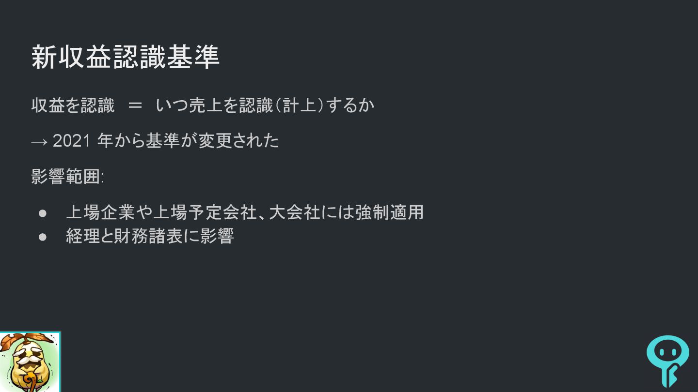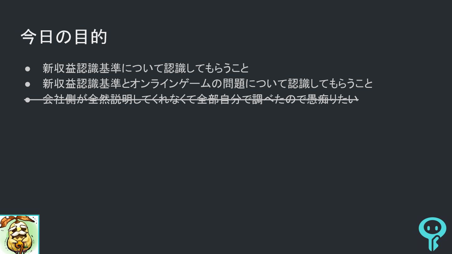 今日の目的 • 新収益認識基準について認識してもらうこと • 新収益認識基準とオンラインゲームの問題について認識してもらうこと • 会社側が全然説明してくれなくて全部自分で調べたので愚痴りたい