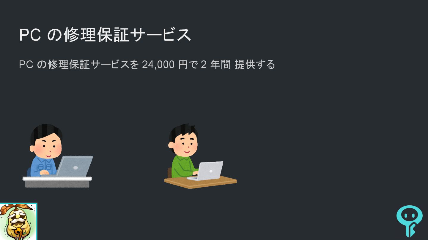 PC の修理保証サービス PC の修理保証サービスを 24,000 円で 2 年間 提供する