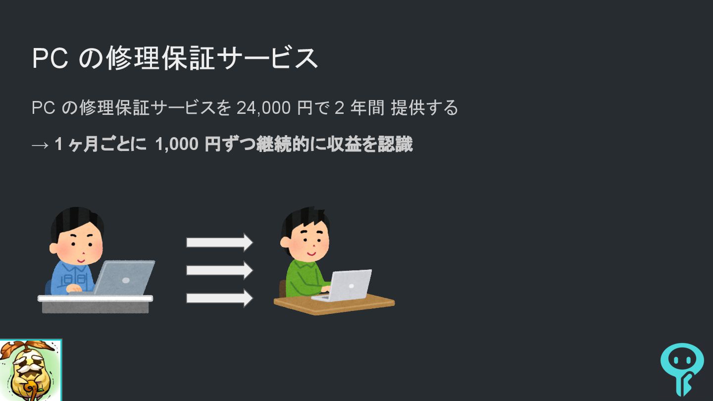 90,000 円の収益を認識 • 1 ヶ月ごとに 1,000 円ずつ収益を認識 PC と 修理保証サービスのセット販売