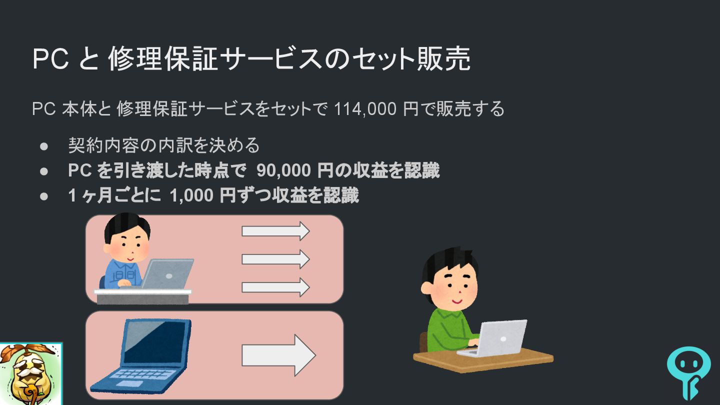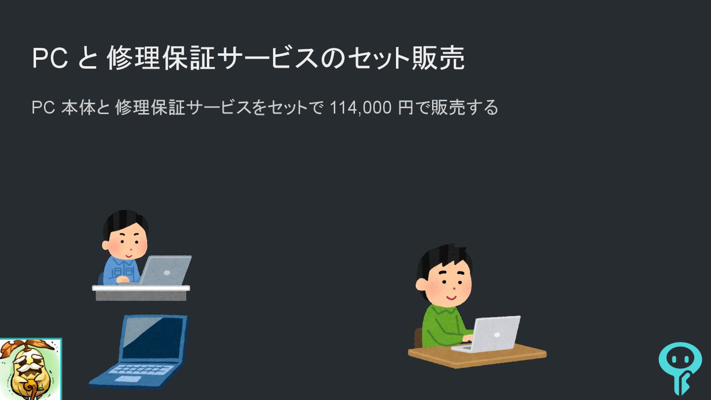 PC 本体と 修理保証サービスをセットで 114,000 円で販売する • 契約内容の内訳を決める • PC を引き渡した時点で