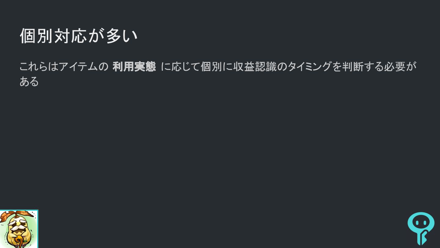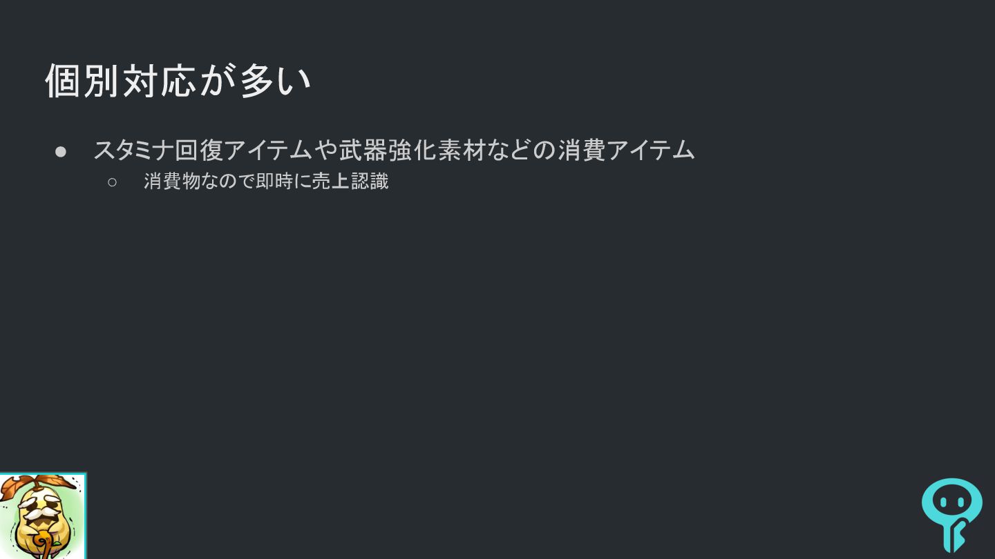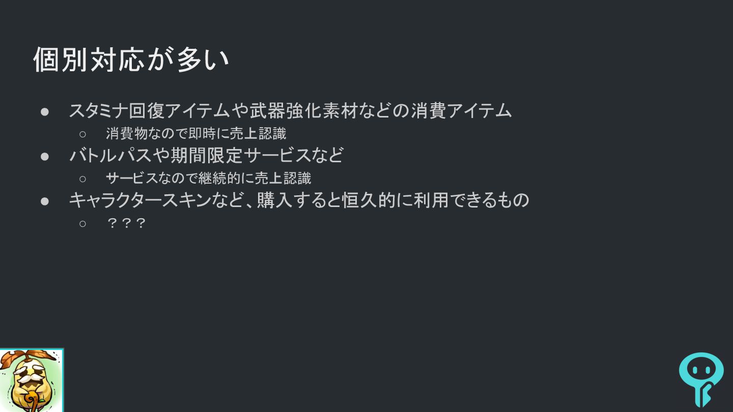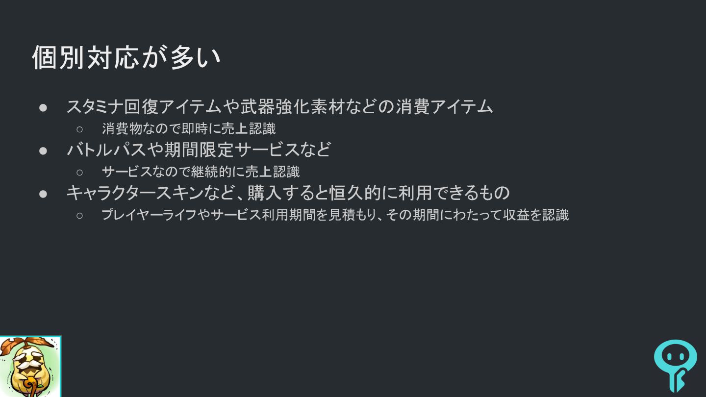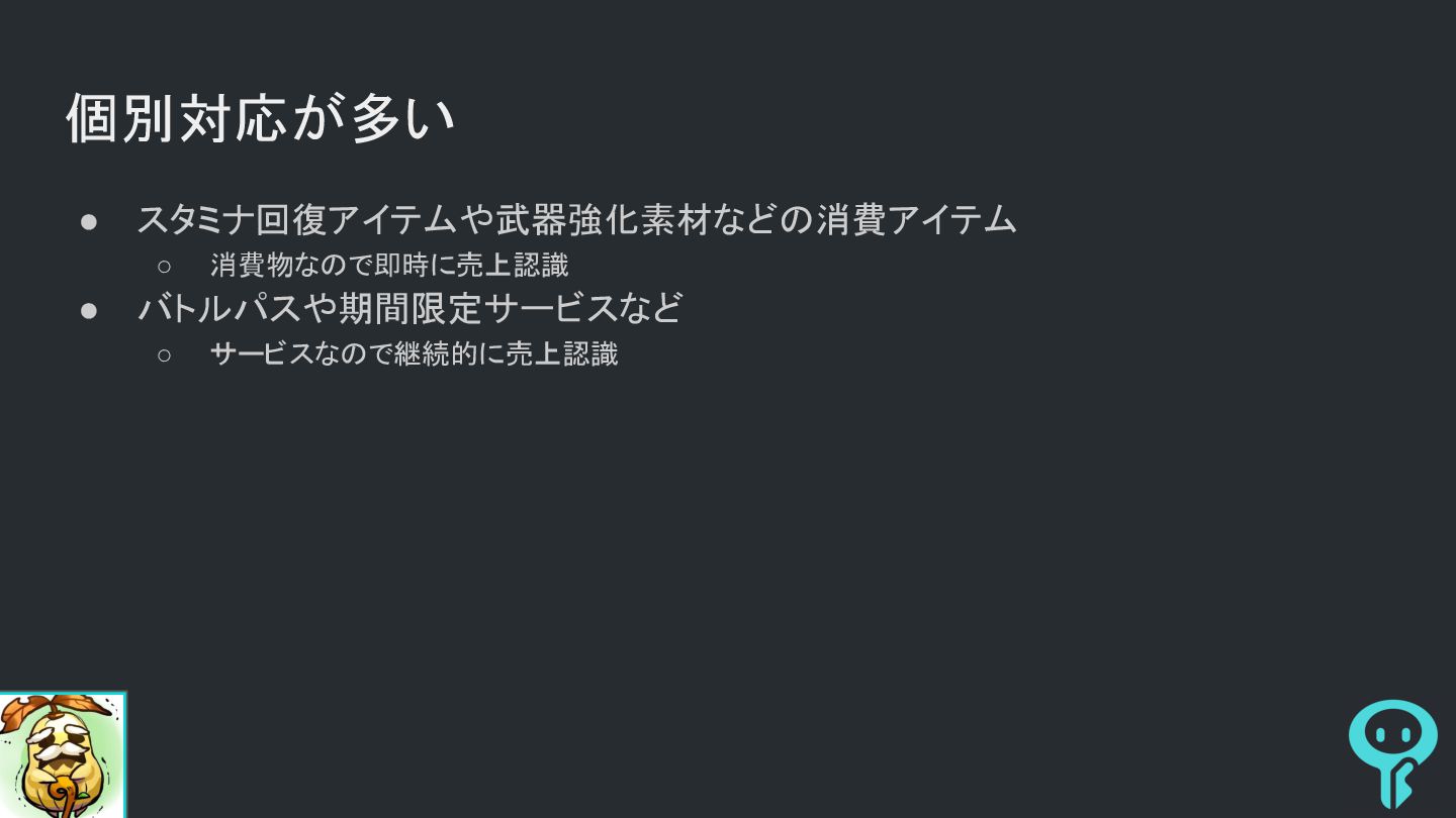 個別対応が多い • スタミナ回復アイテムや武器強化素材などの消費アイテム ◦ 消費物なので即時に売上認識