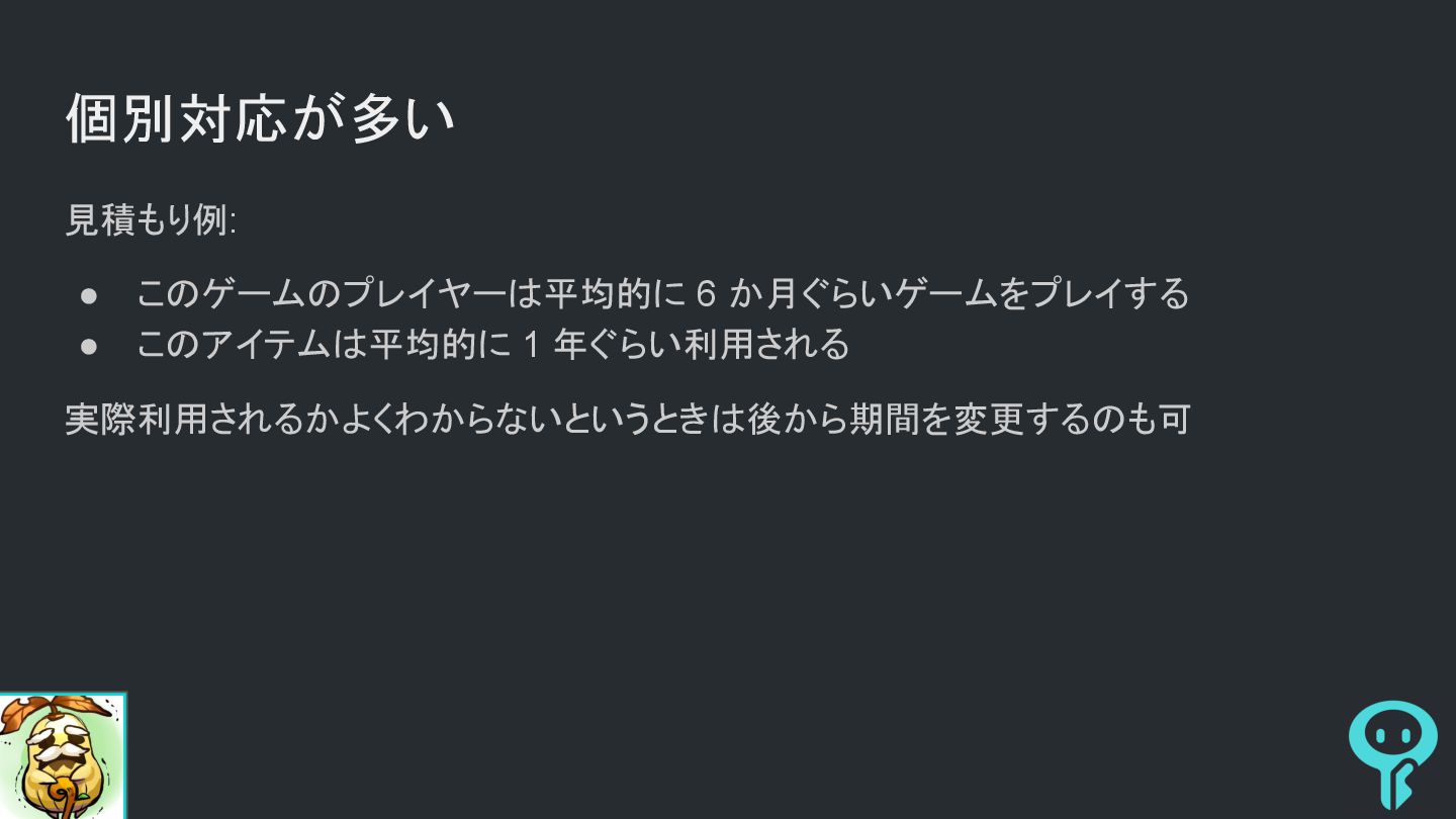 個別対応が多い 見積もり例: • このゲームのプレイヤーは平均的に 6 か月ぐらいゲームをプレイする • このアイテムは平均的に 1 年ぐらい利用される