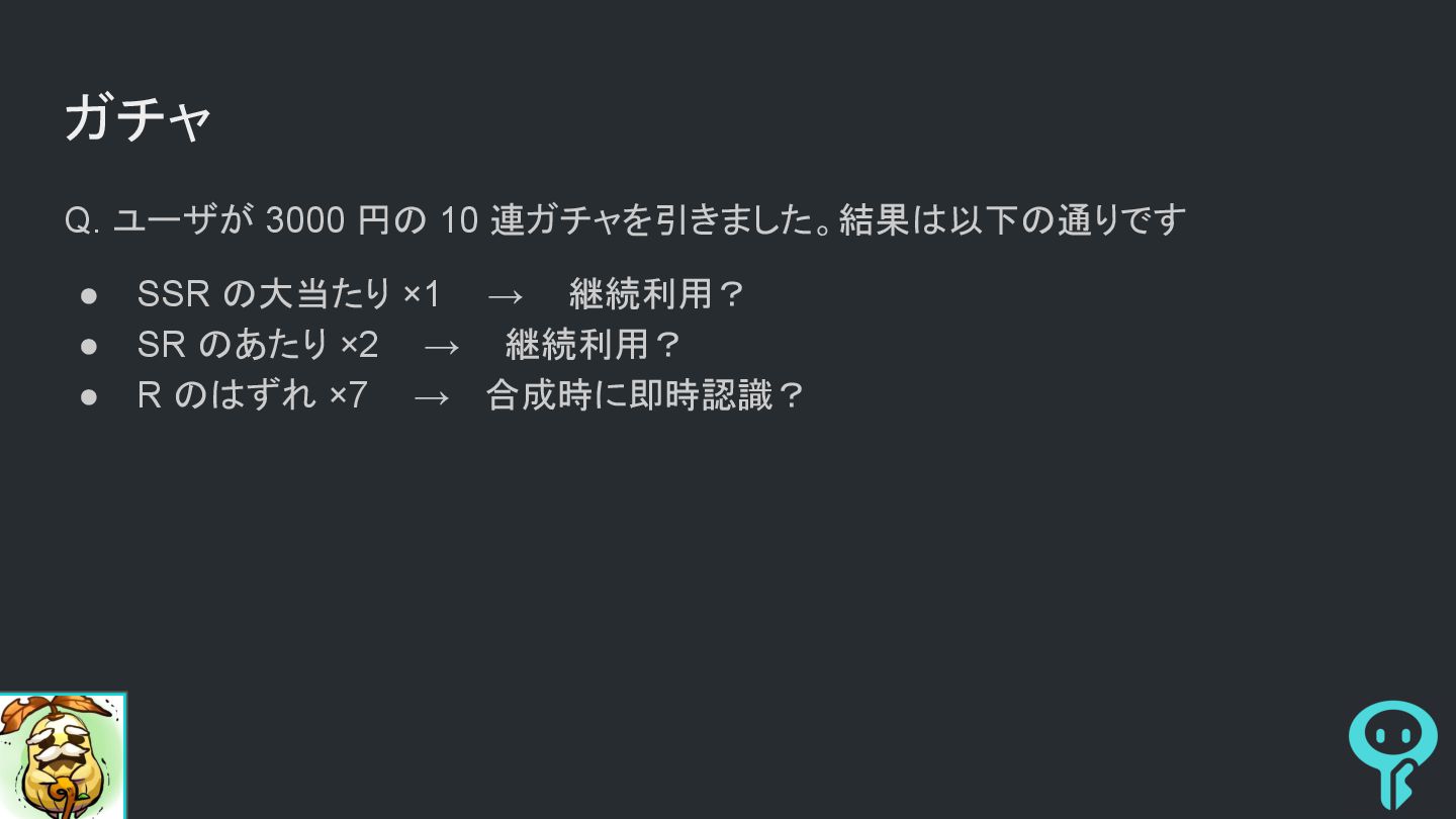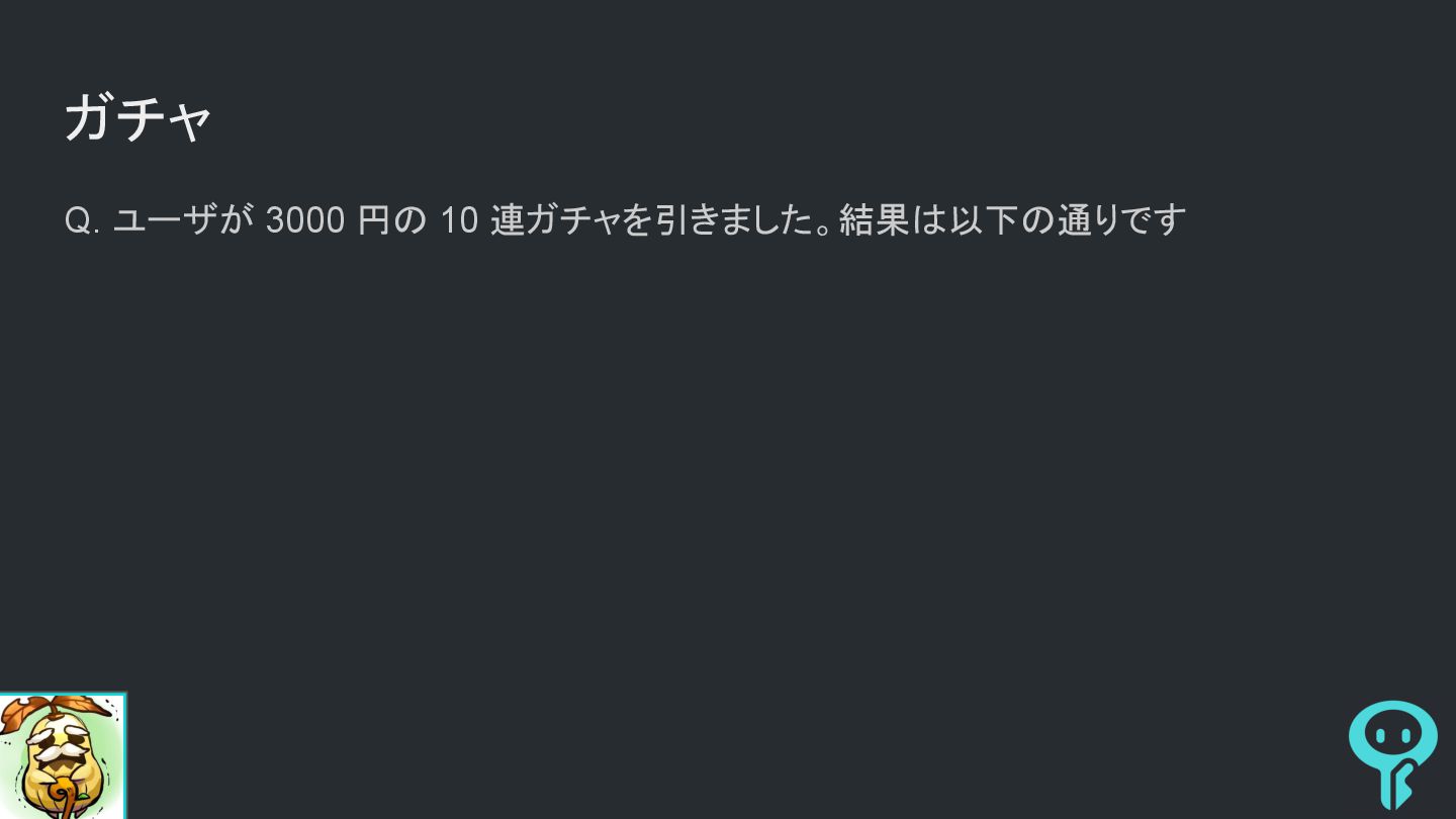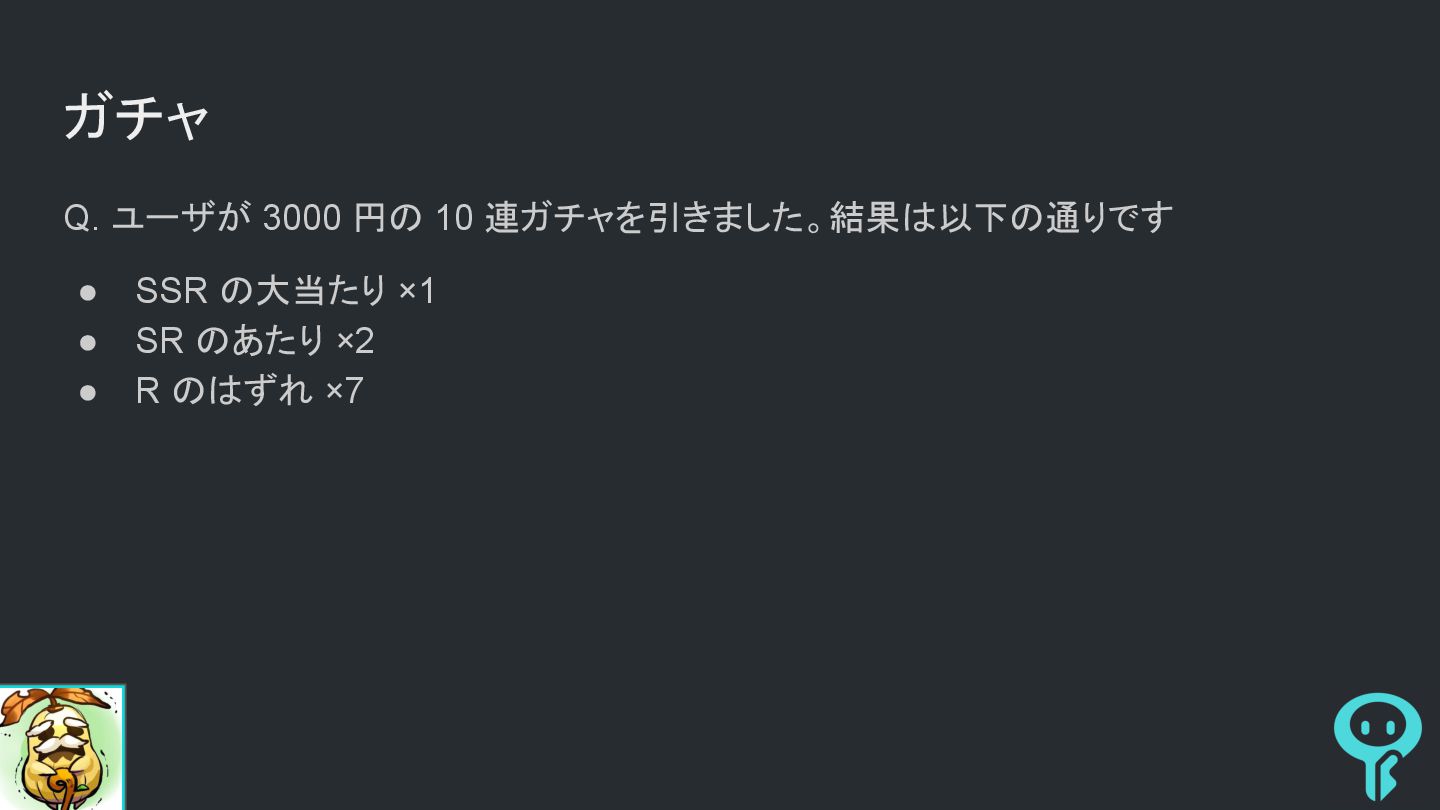 ガチャ Q. ユーザが 3000 円の 10 連ガチャを引きました。結果は以下の通りです
