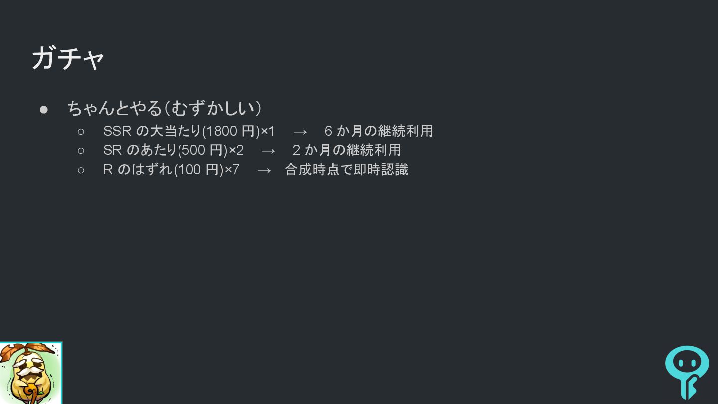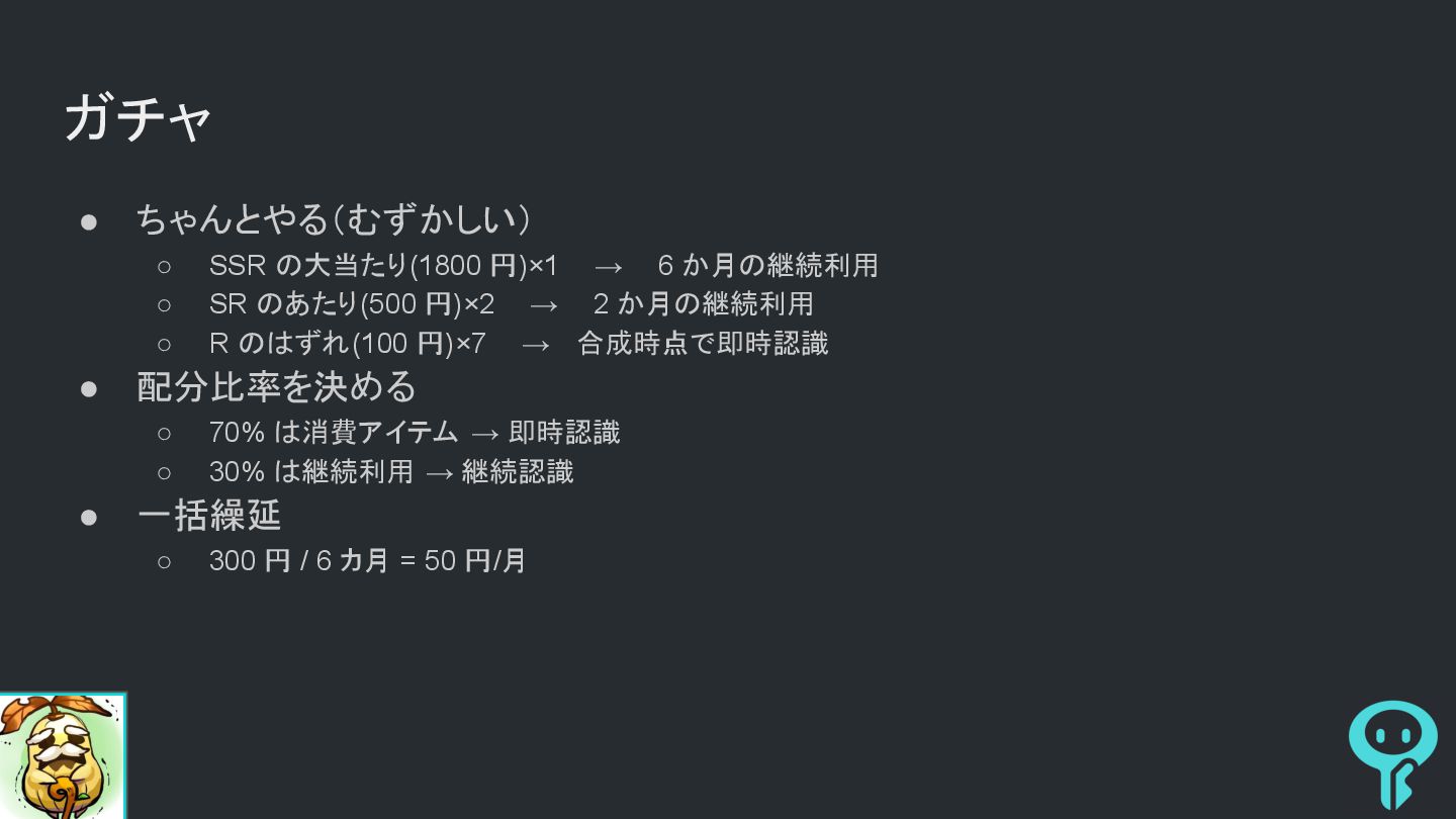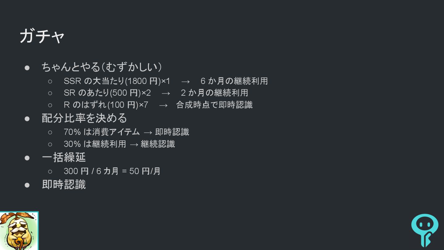 6 か月の継続利用 ◦ SR のあたり(500 円)×2 → 2 か月の継続利用 ◦ R のはずれ(100 円)×7 → 合成時点で即時認識 • 配分比率を決める ◦ 70% は消費アイテム → 即時認識 ◦ 30% は継続利用 → 継続認識 • 一括繰延 ◦ 300 円 / 6 カ月 = 50 円/月