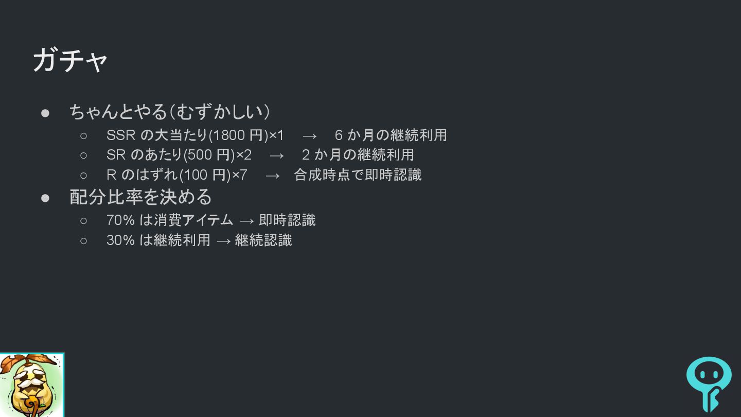 6 か月の継続利用 ◦ SR のあたり(500 円)×2 → 2 か月の継続利用 ◦ R のはずれ(100 円)×7 → 合成時点で即時認識 • 配分比率を決める ◦ 70% は消費アイテム → 即時認識 ◦ 30% は継続利用 → 継続認識