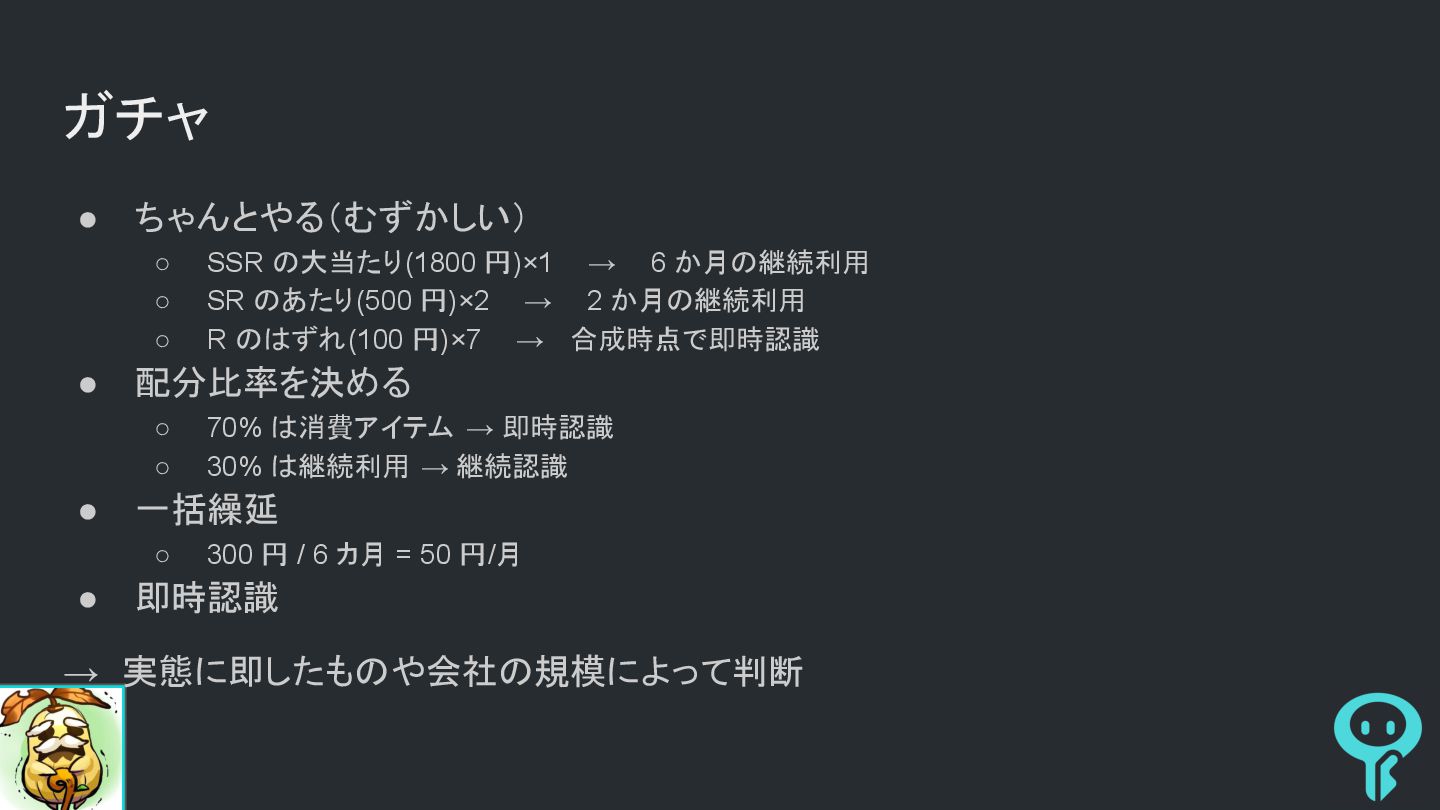 6 か月の継続利用 ◦ SR のあたり(500 円)×2 → 2 か月の継続利用 ◦ R のはずれ(100 円)×7 → 合成時点で即時認識 • 配分比率を決める ◦ 70% は消費アイテム → 即時認識 ◦ 30% は継続利用 → 継続認識 • 一括繰延 ◦ 300 円 / 6 カ月 = 50 円/月 • 即時認識 → 実態に即したものや会社の規模によって判断
