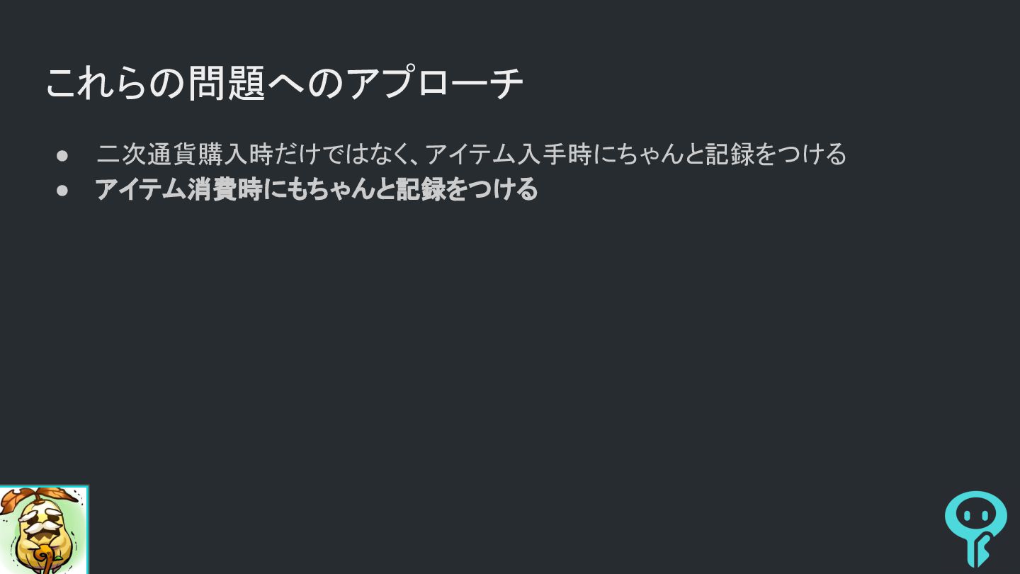 これらの問題へのアプローチ • 二次通貨購入時だけではなく、アイテム入手時にちゃんと記録をつける • アイテム消費時にもちゃんと記録をつける