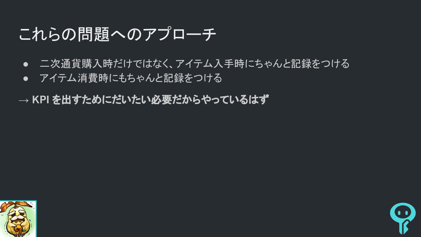 これらの問題へのアプローチ • 二次通貨購入時だけではなく、アイテム入手時にちゃんと記録をつける • アイテム消費時にもちゃんと記録をつける → KPI を出すためにだいたい必要だからやっているはず