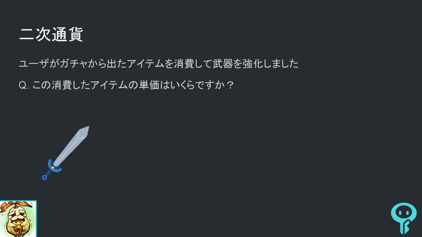 二次通貨 ユーザがガチャから出たアイテムを消費して武器を強化しました Q. この消費したアイテムの単価はいくらですか?
