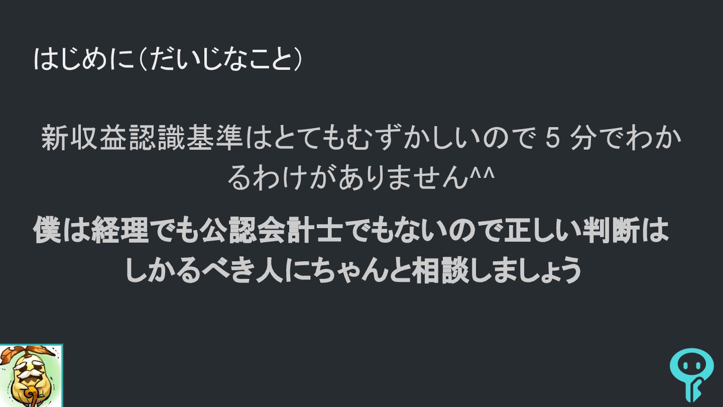はじめに(だいじなこと) 新収益認識基準はとてもむずかしいので 5 分でわか るわけがありません^^ 僕は経理でも公認会計士でもないので正しい判断は しかるべき人にちゃんと相談しましょう