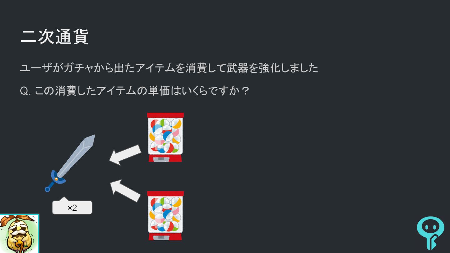 二次通貨 ユーザがガチャから出たアイテムを消費して武器を強化しました Q. この消費したアイテムの単価はいくらですか? ×2