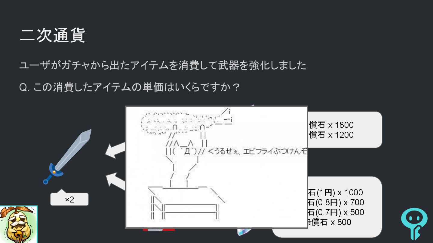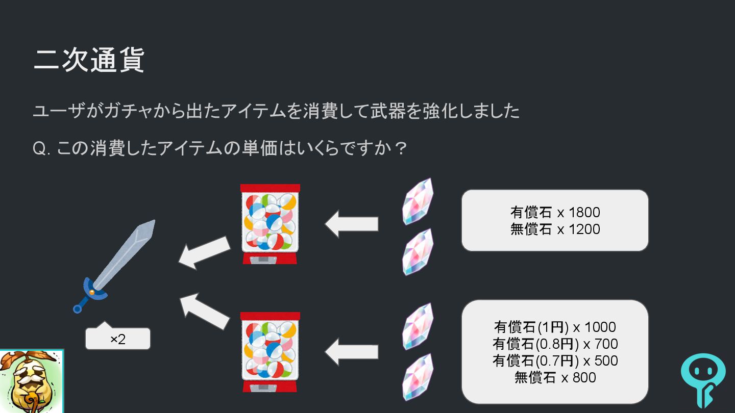 二次通貨 ユーザがガチャから出たアイテムを消費して武器を強化しました Q. この消費したアイテムの単価はいくらですか? ×2 有償石 x 1800 無償石 x