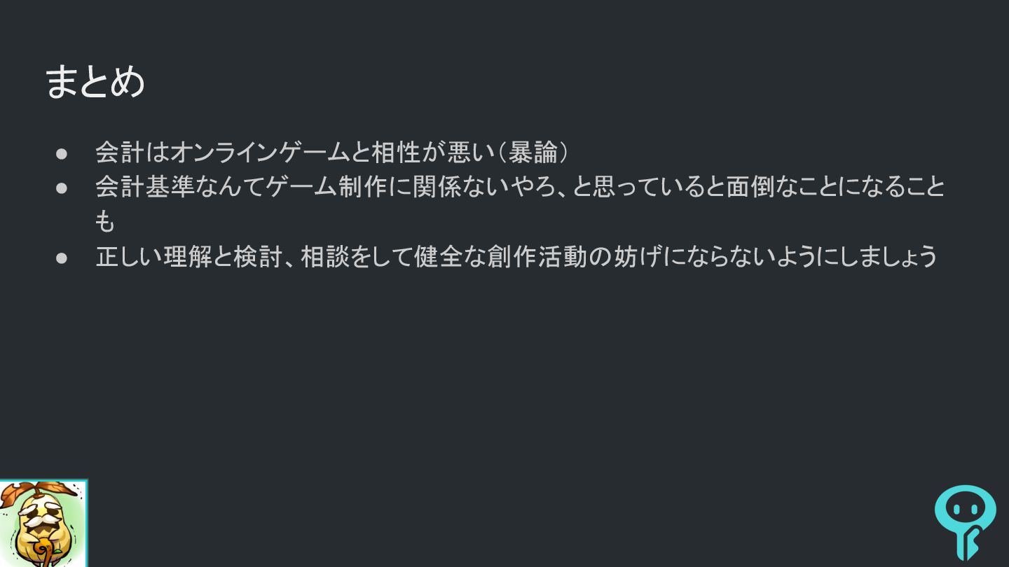 まとめ • 会計はオンラインゲームと相性が悪い(暴論) • 会計基準なんてゲーム制作に関係ないやろ、と思っていると面倒なことになること も • 正しい理解と検討、相談をして健全な創作活動の妨げにならないようにしましょう