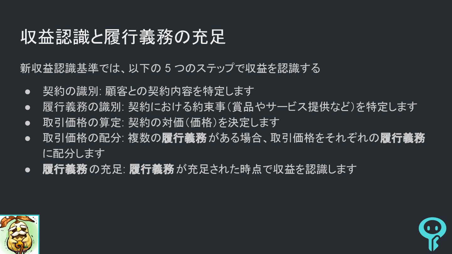 • 取引価格の算定: 契約の対価(価格)を決定します • 取引価格の配分: 複数の履行義務がある場合、取引価格をそれぞれの履行義務 に配分します • 履行義務の充足: 履行義務が充足された時点で収益を認識します