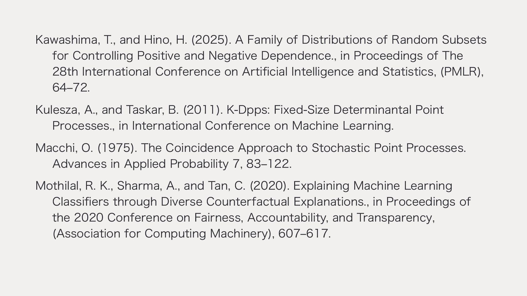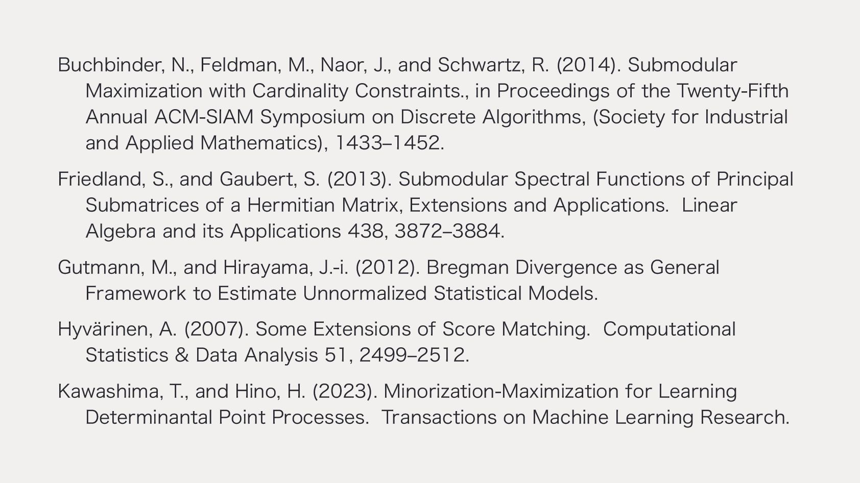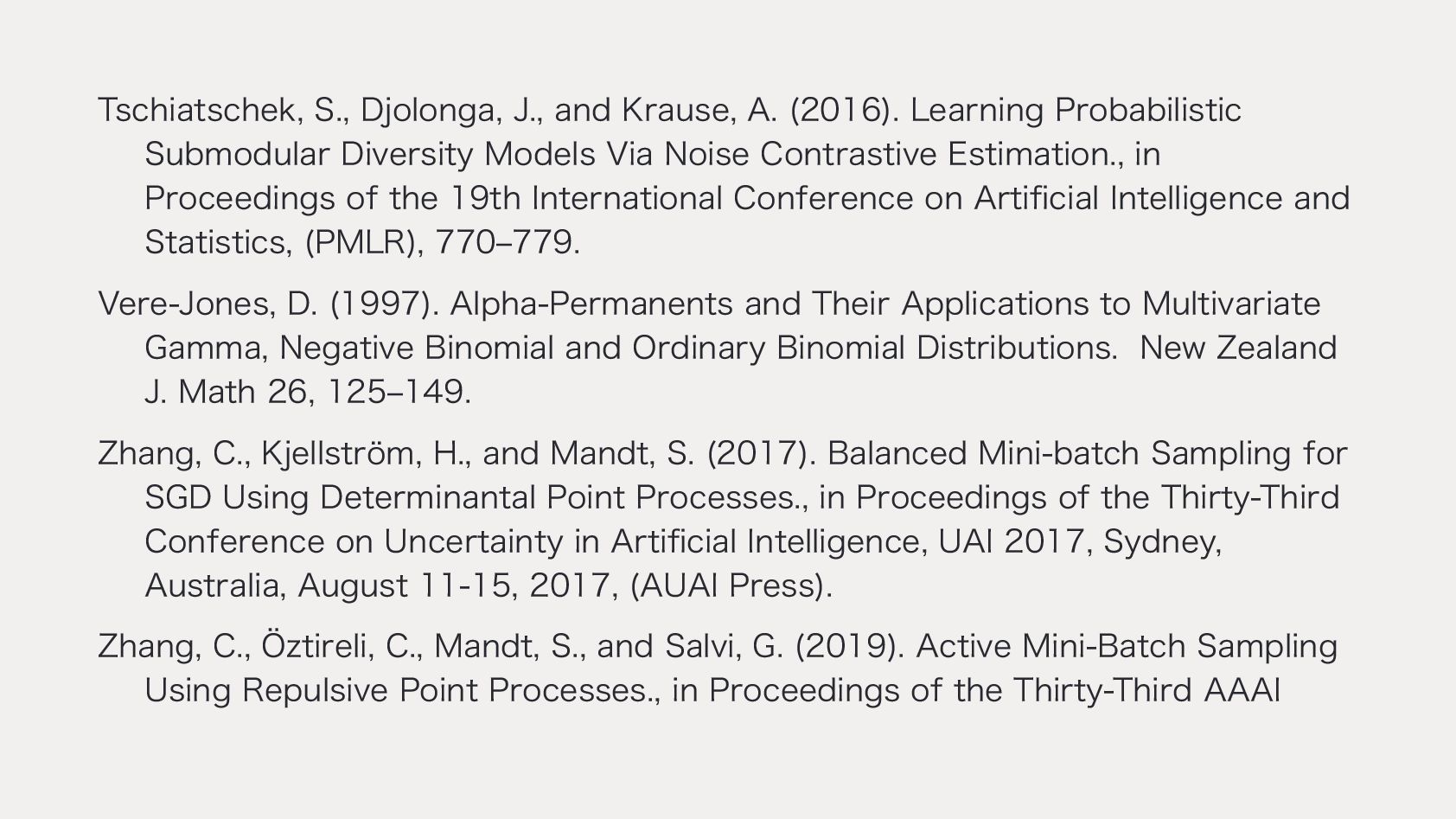 Submodular Diversity Models Via Noise Contrastive Estimation., in Proceedings of the 19th International Conference on Artificial Intelligence and Statistics, (PMLR), 770–779. Vere-Jones, D. (1997). Alpha-Permanents and Their Applications to Multivariate Gamma, Negative Binomial and Ordinary Binomial Distributions. New Zealand J. Math 26, 125–149. Zhang, C., Kjellström, H., and Mandt, S. (2017). Balanced Mini-batch Sampling for SGD Using Determinantal Point Processes., in Proceedings of the Thirty-Third Conference on Uncertainty in Artificial Intelligence, UAI 2017, Sydney, Australia, August 11-15, 2017, (AUAI Press). Zhang, C., Öztireli, C., Mandt, S., and Salvi, G. (2019). Active Mini-Batch Sampling Using Repulsive Point Processes., in Proceedings of the Thirty-Third AAAI