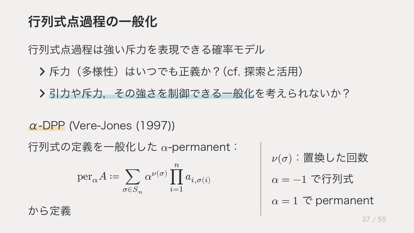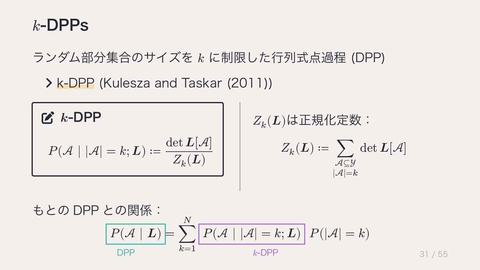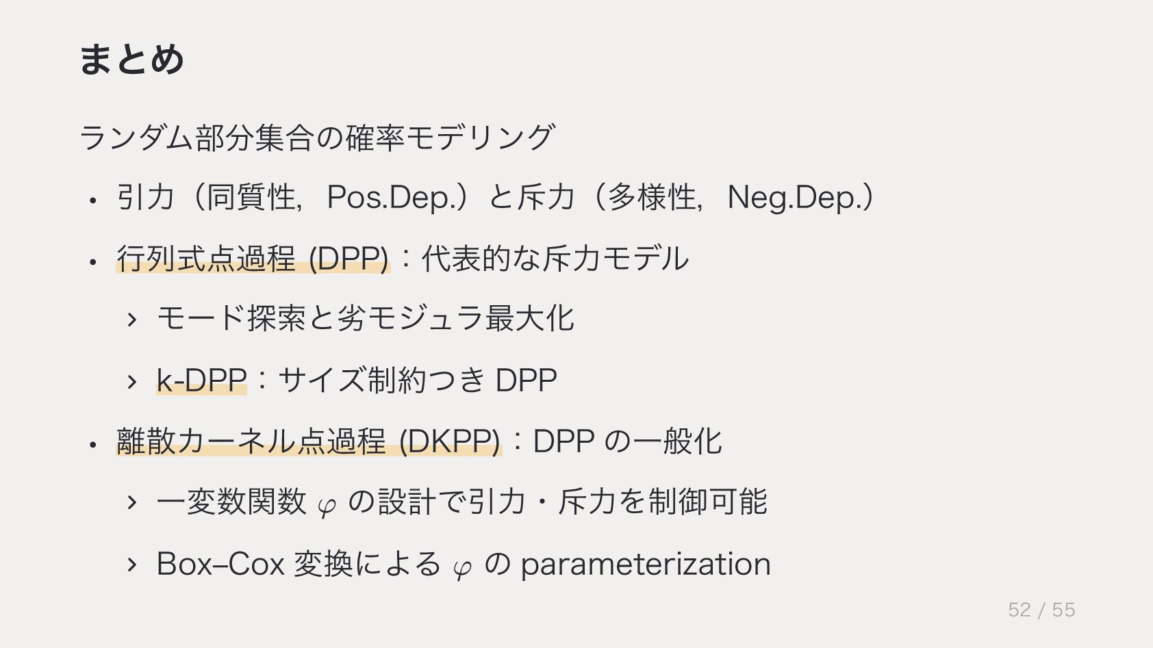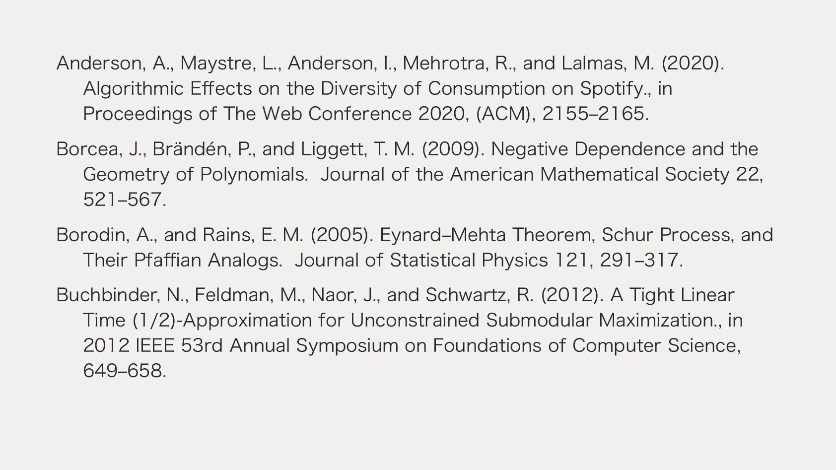 Submodular Diversity Models Via Noise Contrastive Estimation., in Proceedings of the 19th International Conference on Artificial Intelligence and Statistics, (PMLR), 770–779. Vere-Jones, D. (1997). Alpha-Permanents and Their Applications to Multivariate Gamma, Negative Binomial and Ordinary Binomial Distributions. New Zealand J. Math 26, 125–149. Zhang, C., Kjellström, H., and Mandt, S. (2017). Balanced Mini-batch Sampling for SGD Using Determinantal Point Processes., in Proceedings of the Thirty-Third Conference on Uncertainty in Artificial Intelligence, UAI 2017, Sydney, Australia, August 11-15, 2017, (AUAI Press). Zhang, C., Öztireli, C., Mandt, S., and Salvi, G. (2019). Active Mini-Batch Sampling Using Repulsive Point Processes., in Proceedings of the Thirty-Third AAAI