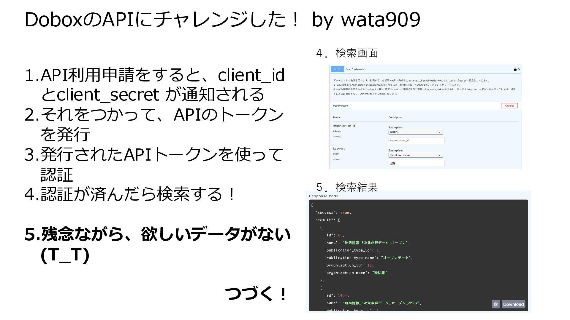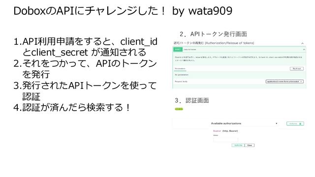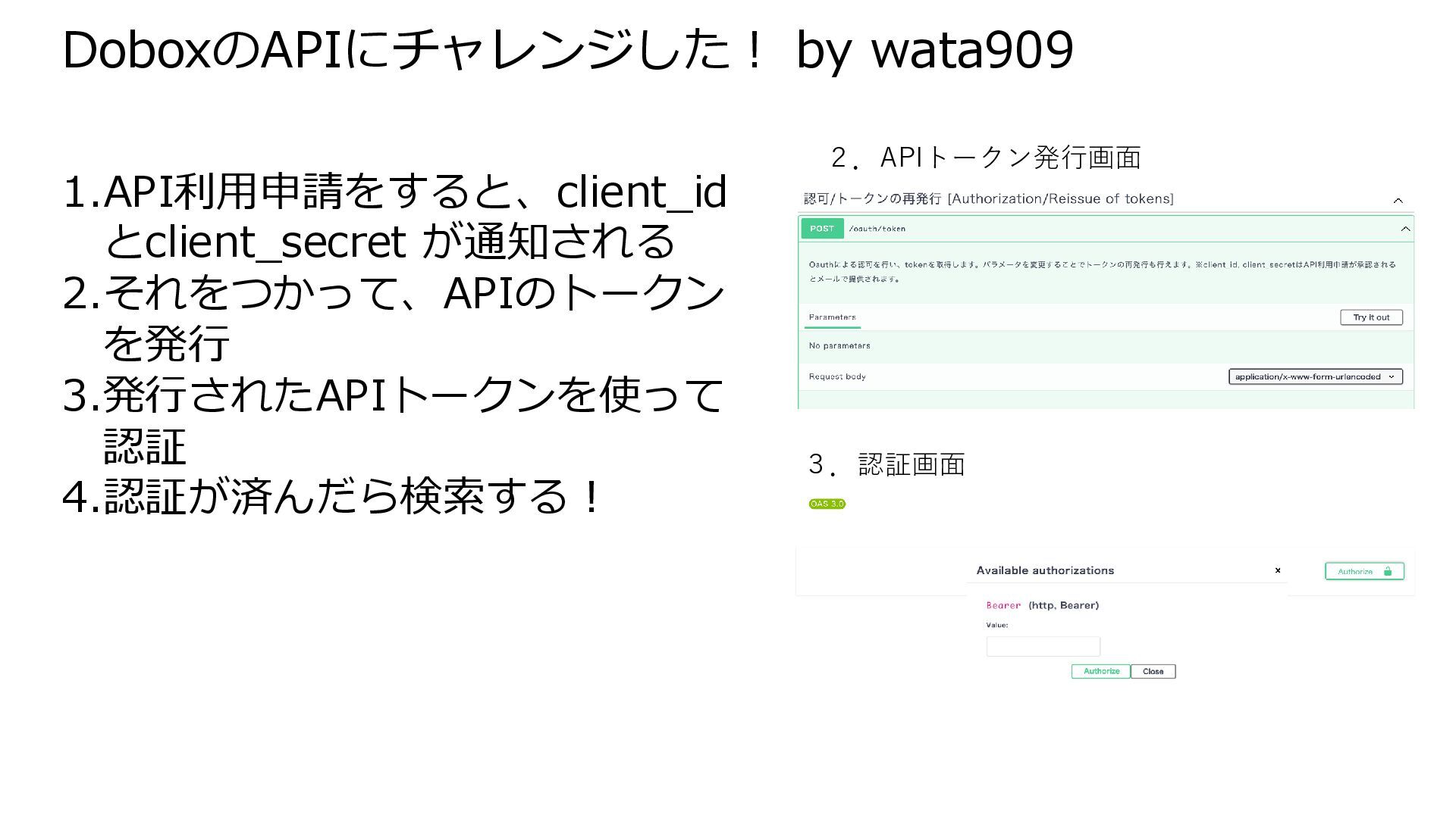 DoboxのAPIにチャレンジした! by wata909 1.API利用申請をすると、client_id とclient_secret が通知される 2.それをつかって、APIのトークン を発行 3.発行されたAPIトークンを使って 認証