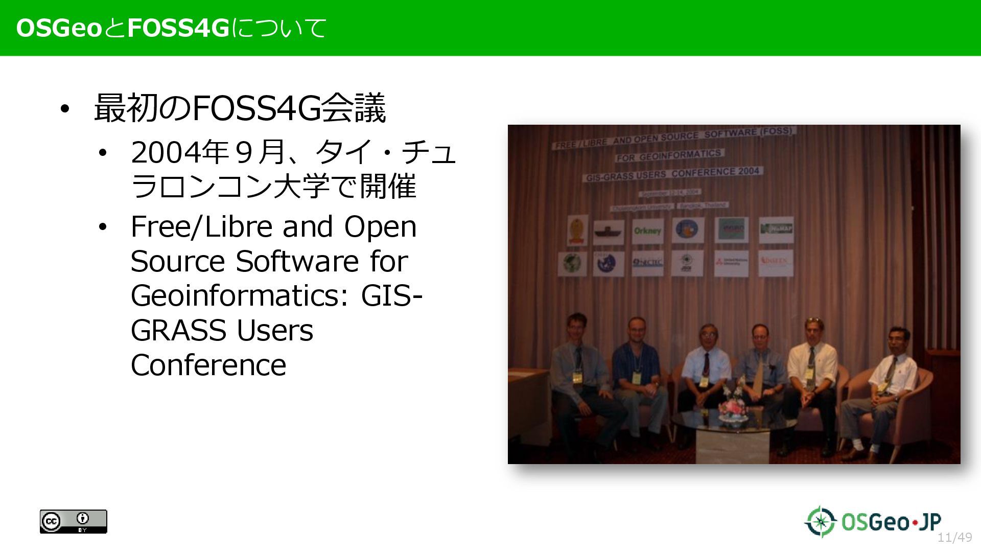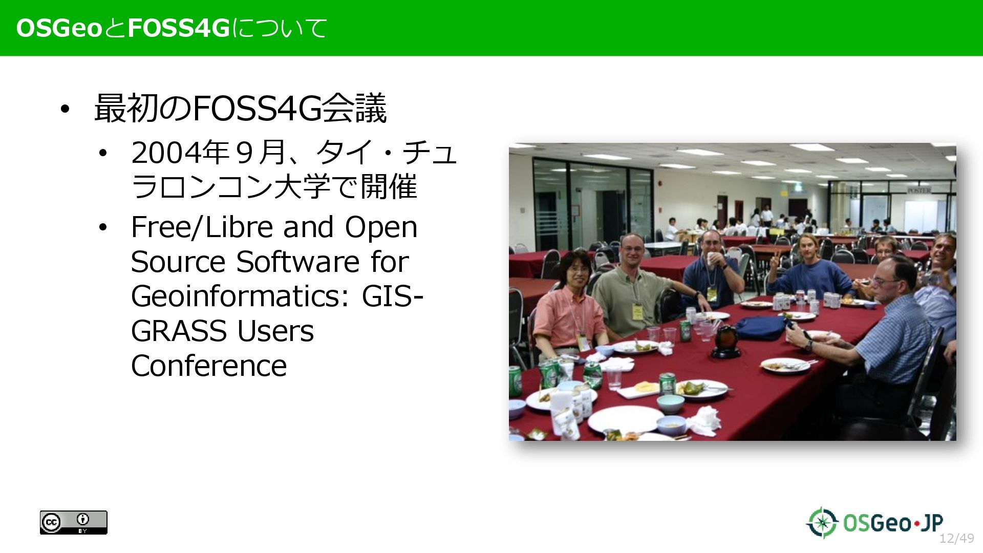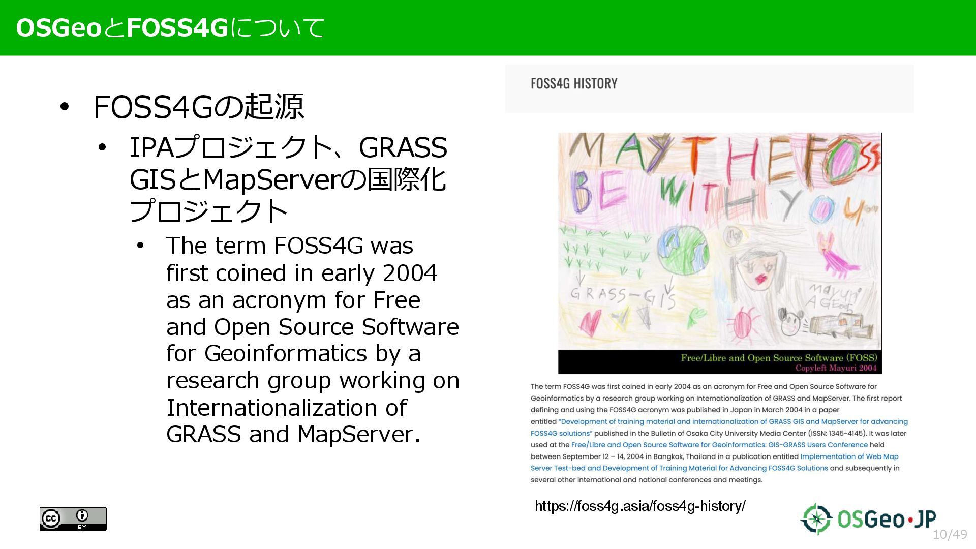 FOSS4G was first coined in early 2004 as an acronym for Free and Open Source Software for Geoinformatics by a research group working on Internationalization of GRASS and MapServer. https://foss4g.asia/foss4g-history/ 10/49