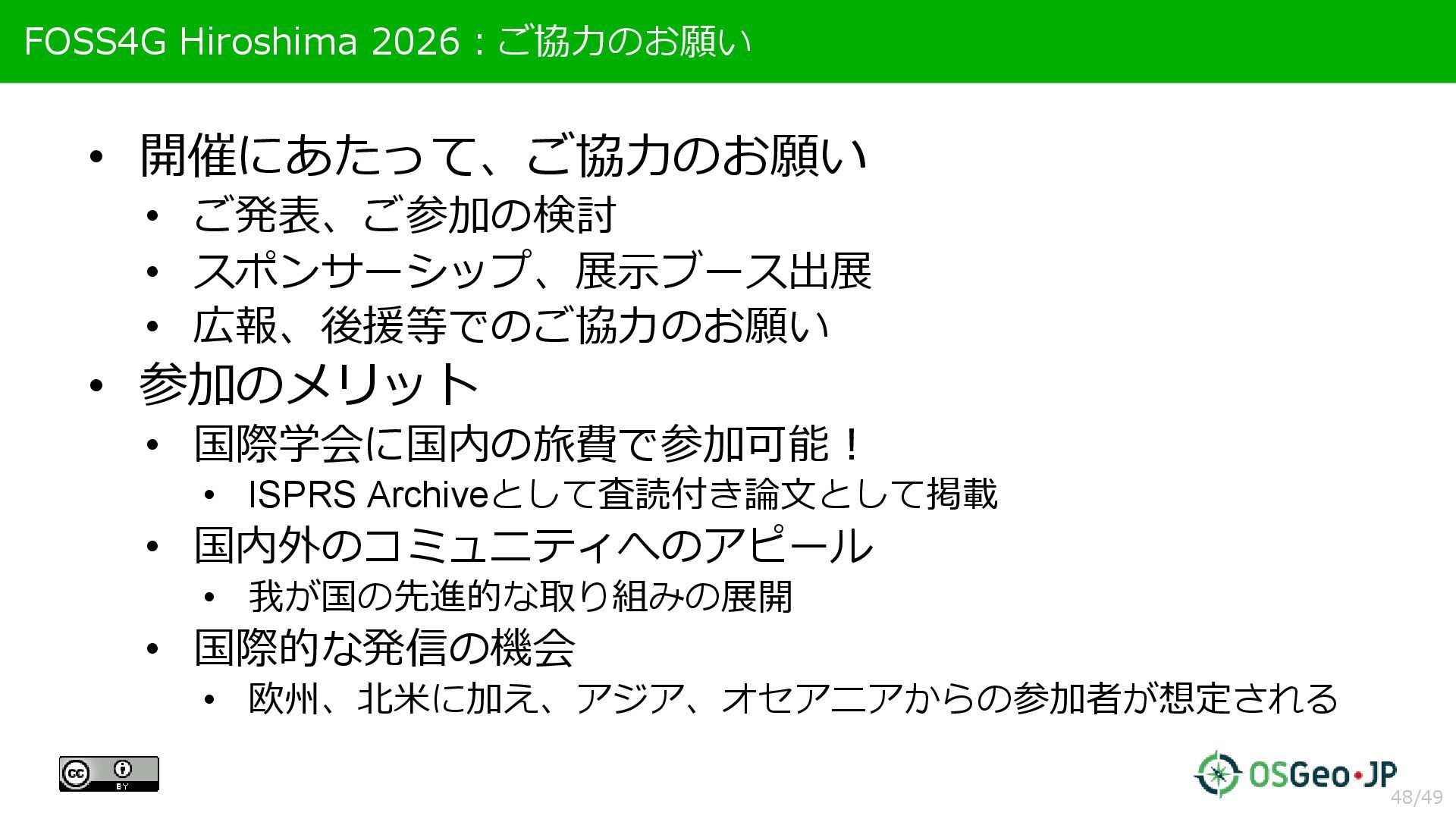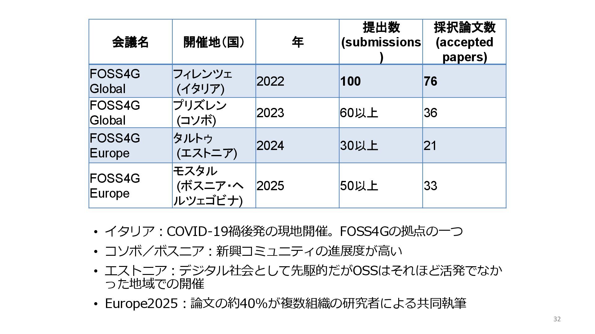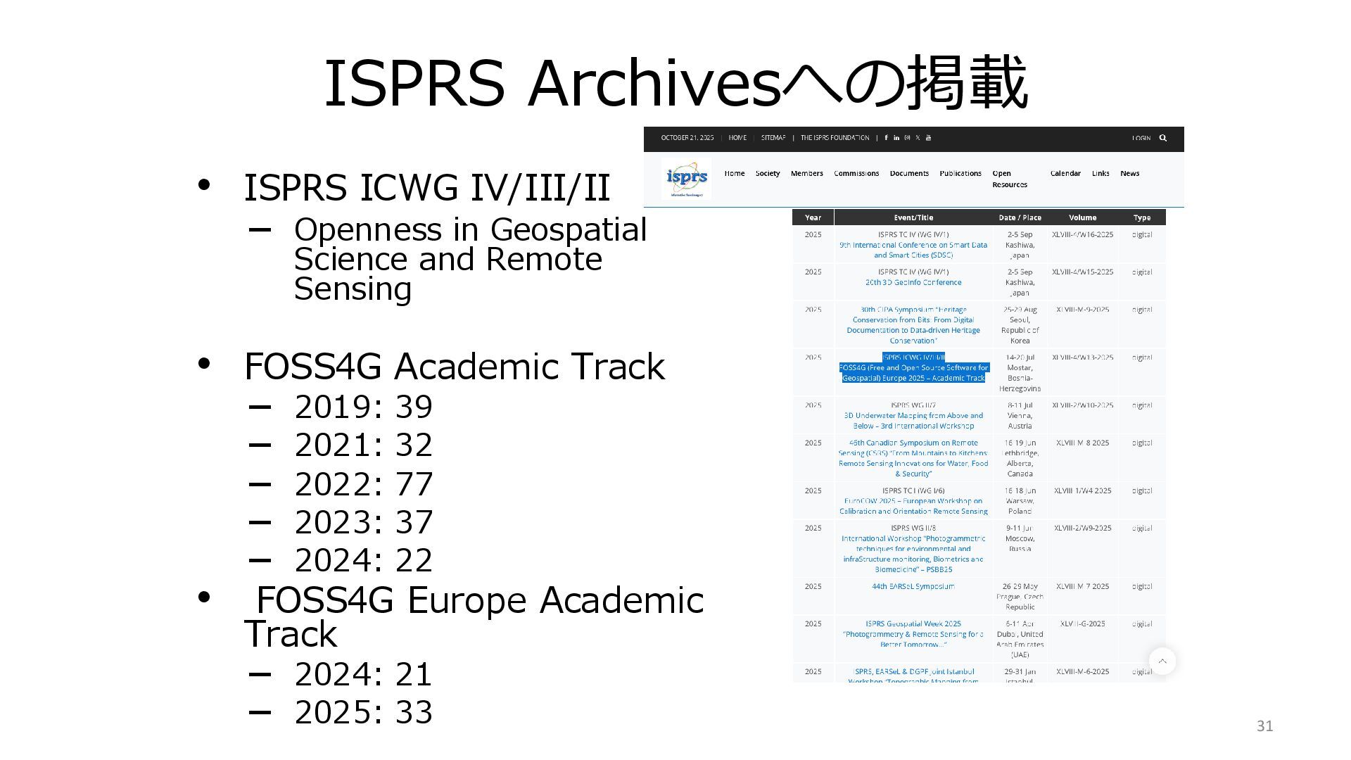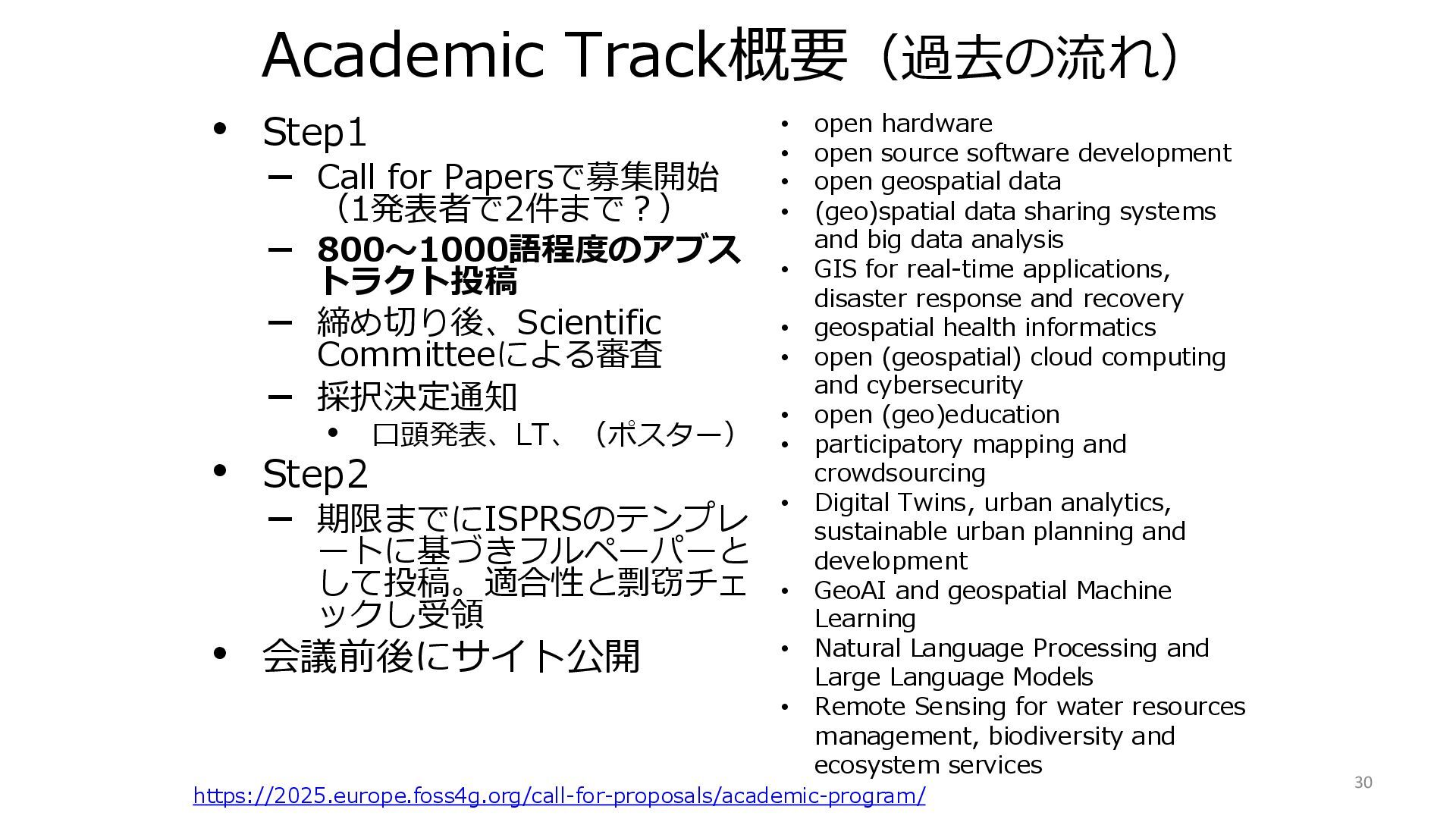 800〜1000語程度のアブス トラクト投稿 – 締め切り後、Scientific Committeeによる審査 – 採択決定通知 • 口頭発表、LT、(ポスター) • Step2 – 期限までにISPRSのテンプレ ートに基づきフルペーパーと して投稿。適合性と剽窃チェ ックし受領 • 会議前後にサイト公開 https://2025.europe.foss4g.org/call-for-proposals/academic-program/ • open hardware • open source software development • open geospatial data • (geo)spatial data sharing systems and big data analysis • GIS for real-time applications, disaster response and recovery • geospatial health informatics • open (geospatial) cloud computing and cybersecurity • open (geo)education • participatory mapping and crowdsourcing • Digital Twins, urban analytics, sustainable urban planning and development • GeoAI and geospatial Machine Learning • Natural Language Processing and Large Language Models • Remote Sensing for water resources management, biodiversity and ecosystem services 30