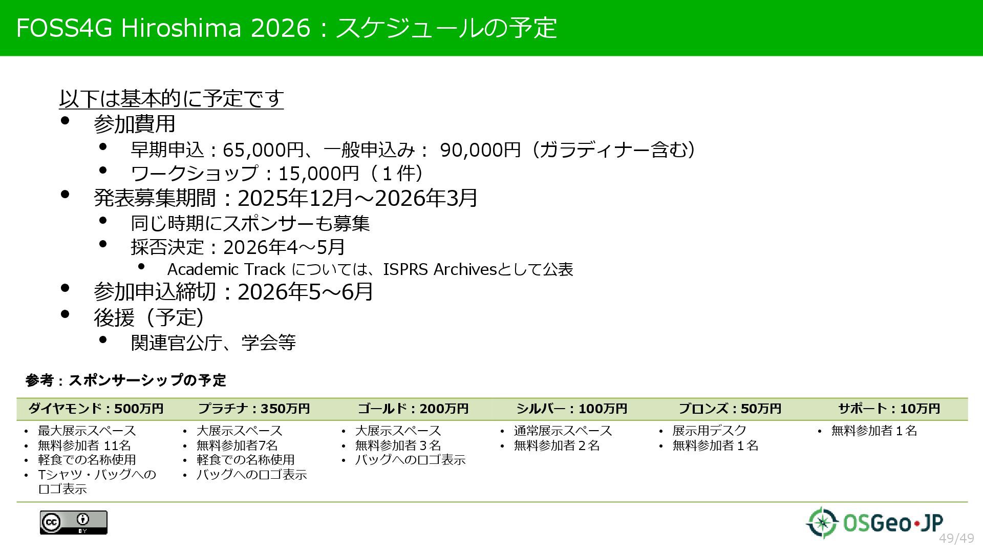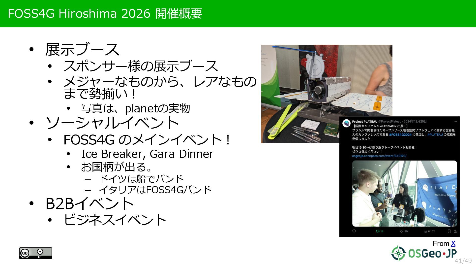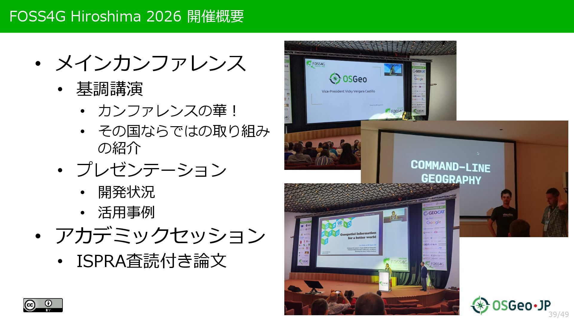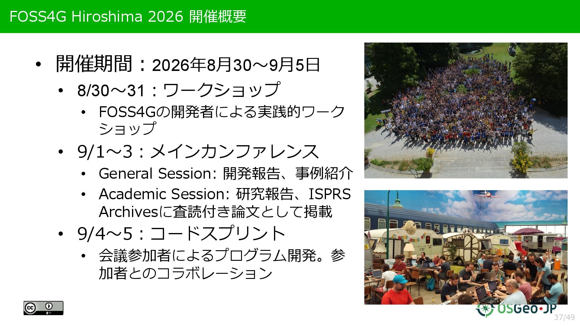 800〜1000語程度のアブス トラクト投稿 – 締め切り後、Scientific Committeeによる審査 – 採択決定通知 • 口頭発表、LT、(ポスター) • Step2 – 期限までにISPRSのテンプレ ートに基づきフルペーパーと して投稿。適合性と剽窃チェ ックし受領 • 会議前後にサイト公開 https://2025.europe.foss4g.org/call-for-proposals/academic-program/ • open hardware • open source software development • open geospatial data • (geo)spatial data sharing systems and big data analysis • GIS for real-time applications, disaster response and recovery • geospatial health informatics • open (geospatial) cloud computing and cybersecurity • open (geo)education • participatory mapping and crowdsourcing • Digital Twins, urban analytics, sustainable urban planning and development • GeoAI and geospatial Machine Learning • Natural Language Processing and Large Language Models • Remote Sensing for water resources management, biodiversity and ecosystem services 30