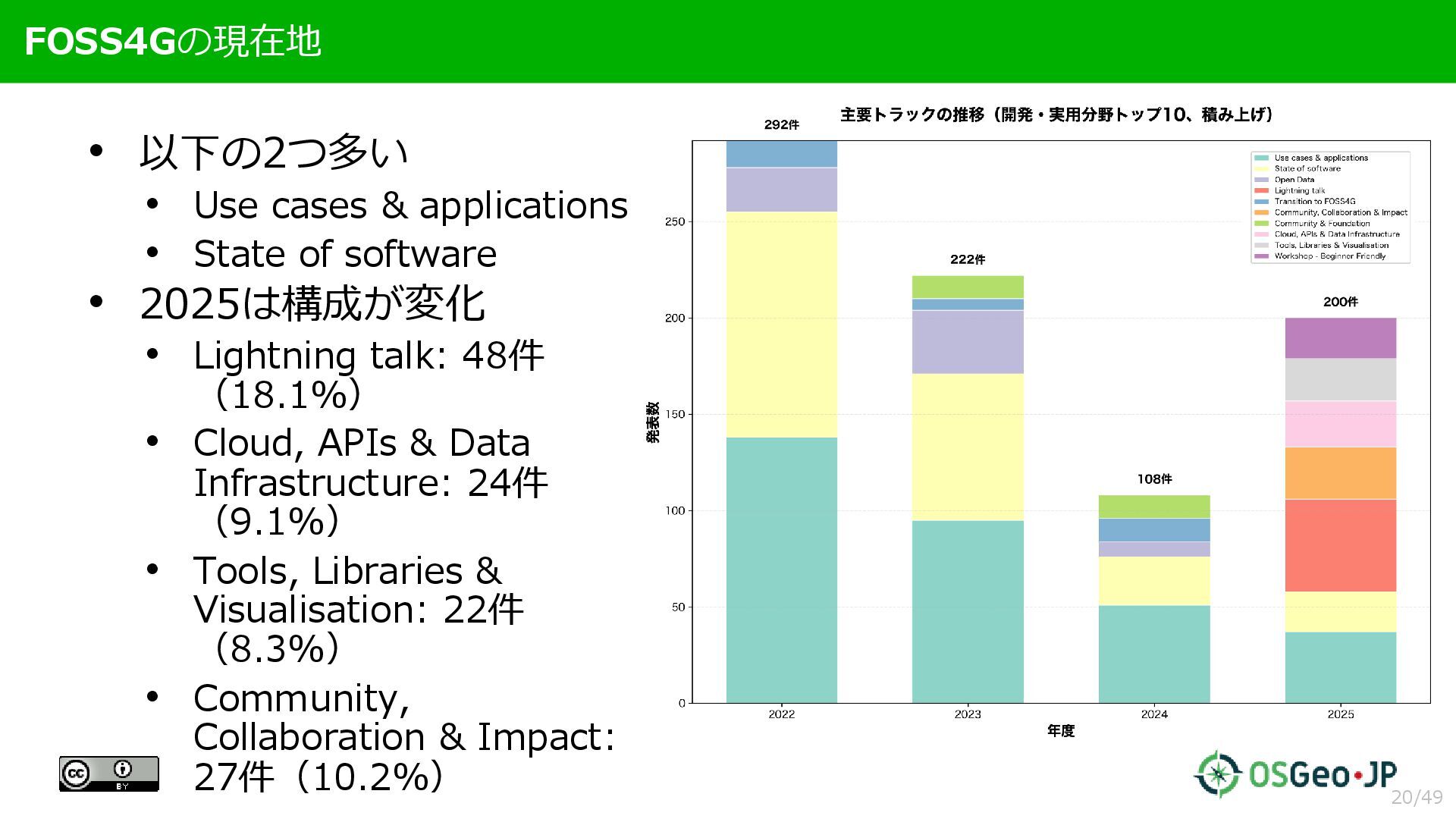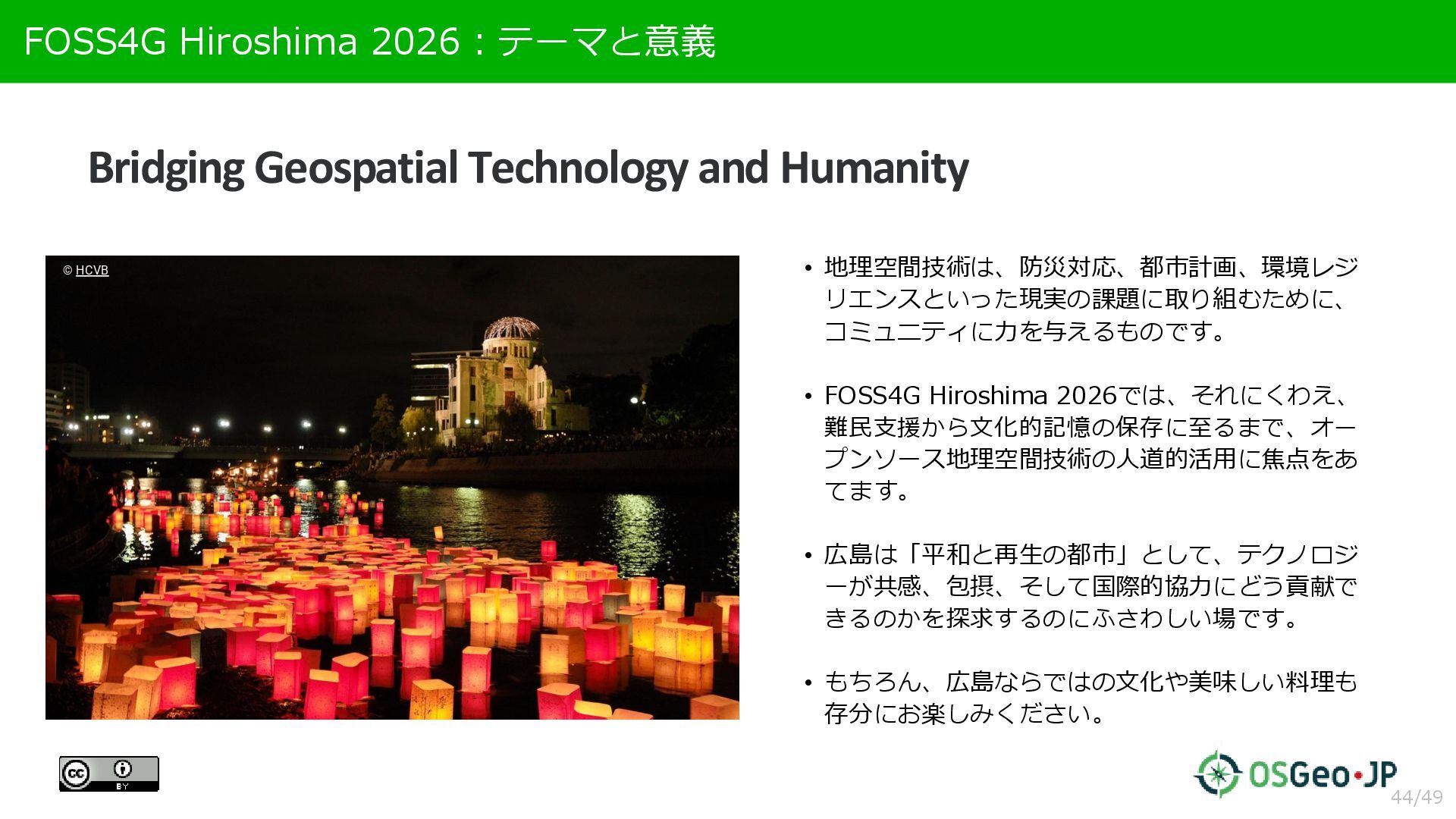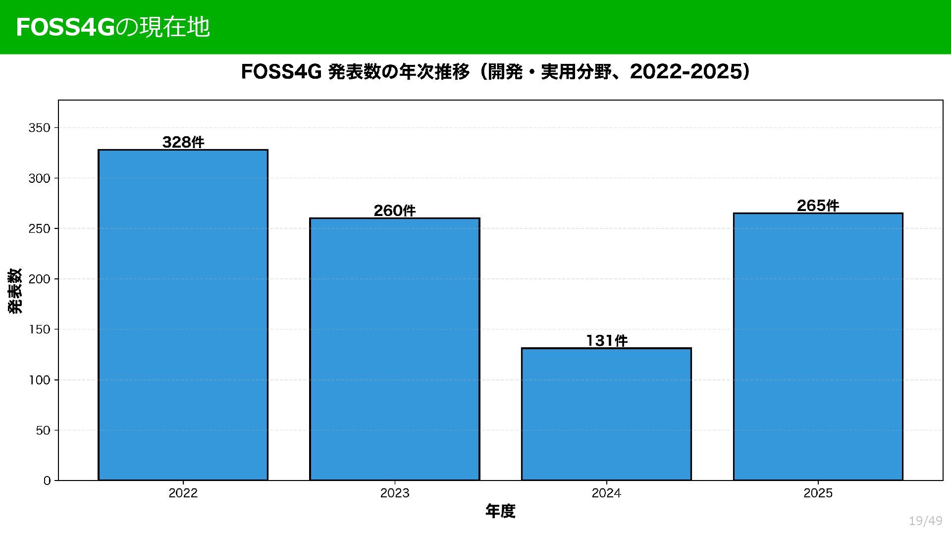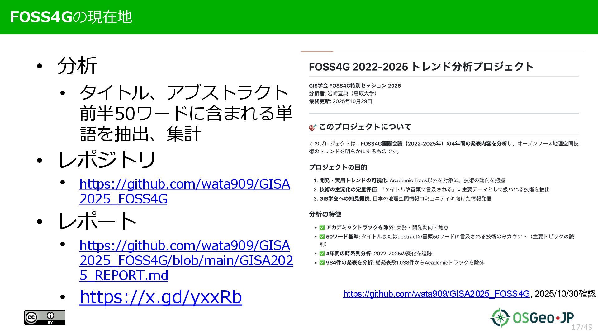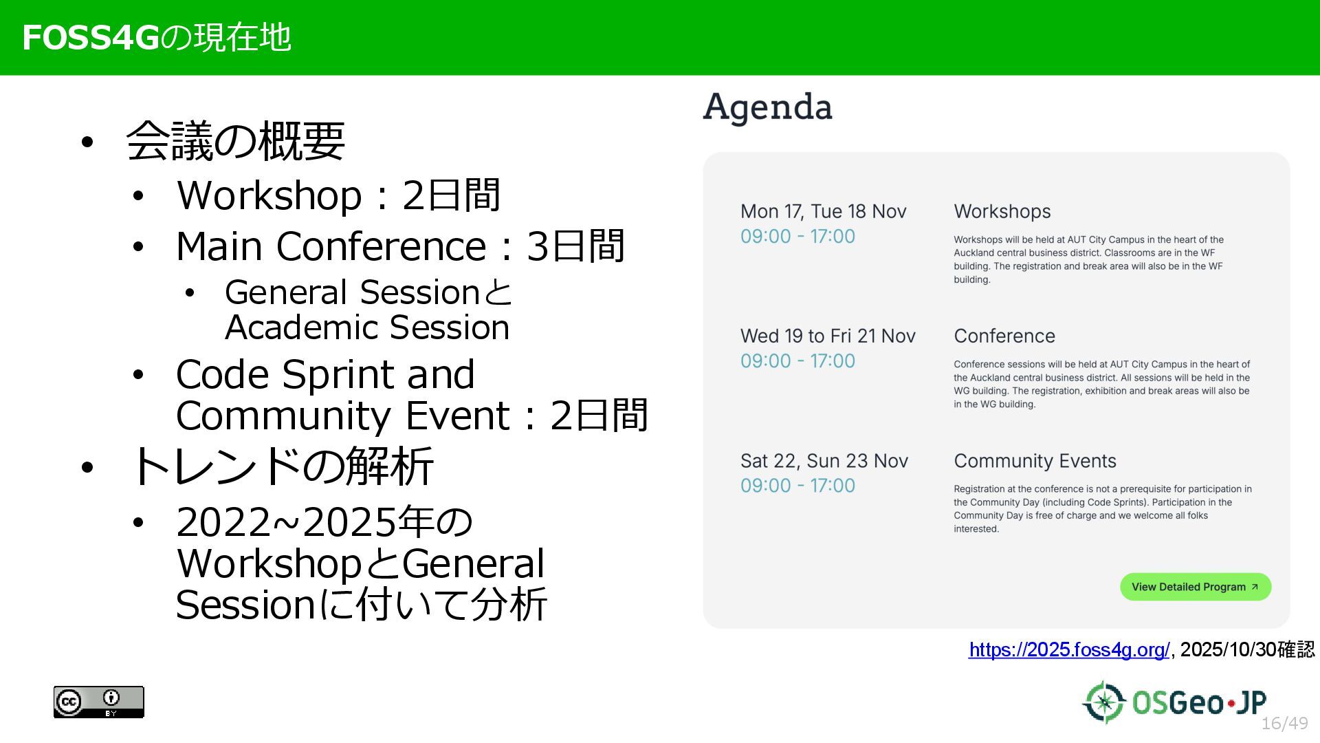 800〜1000語程度のアブス トラクト投稿 – 締め切り後、Scientific Committeeによる審査 – 採択決定通知 • 口頭発表、LT、(ポスター) • Step2 – 期限までにISPRSのテンプレ ートに基づきフルペーパーと して投稿。適合性と剽窃チェ ックし受領 • 会議前後にサイト公開 https://2025.europe.foss4g.org/call-for-proposals/academic-program/ • open hardware • open source software development • open geospatial data • (geo)spatial data sharing systems and big data analysis • GIS for real-time applications, disaster response and recovery • geospatial health informatics • open (geospatial) cloud computing and cybersecurity • open (geo)education • participatory mapping and crowdsourcing • Digital Twins, urban analytics, sustainable urban planning and development • GeoAI and geospatial Machine Learning • Natural Language Processing and Large Language Models • Remote Sensing for water resources management, biodiversity and ecosystem services 30