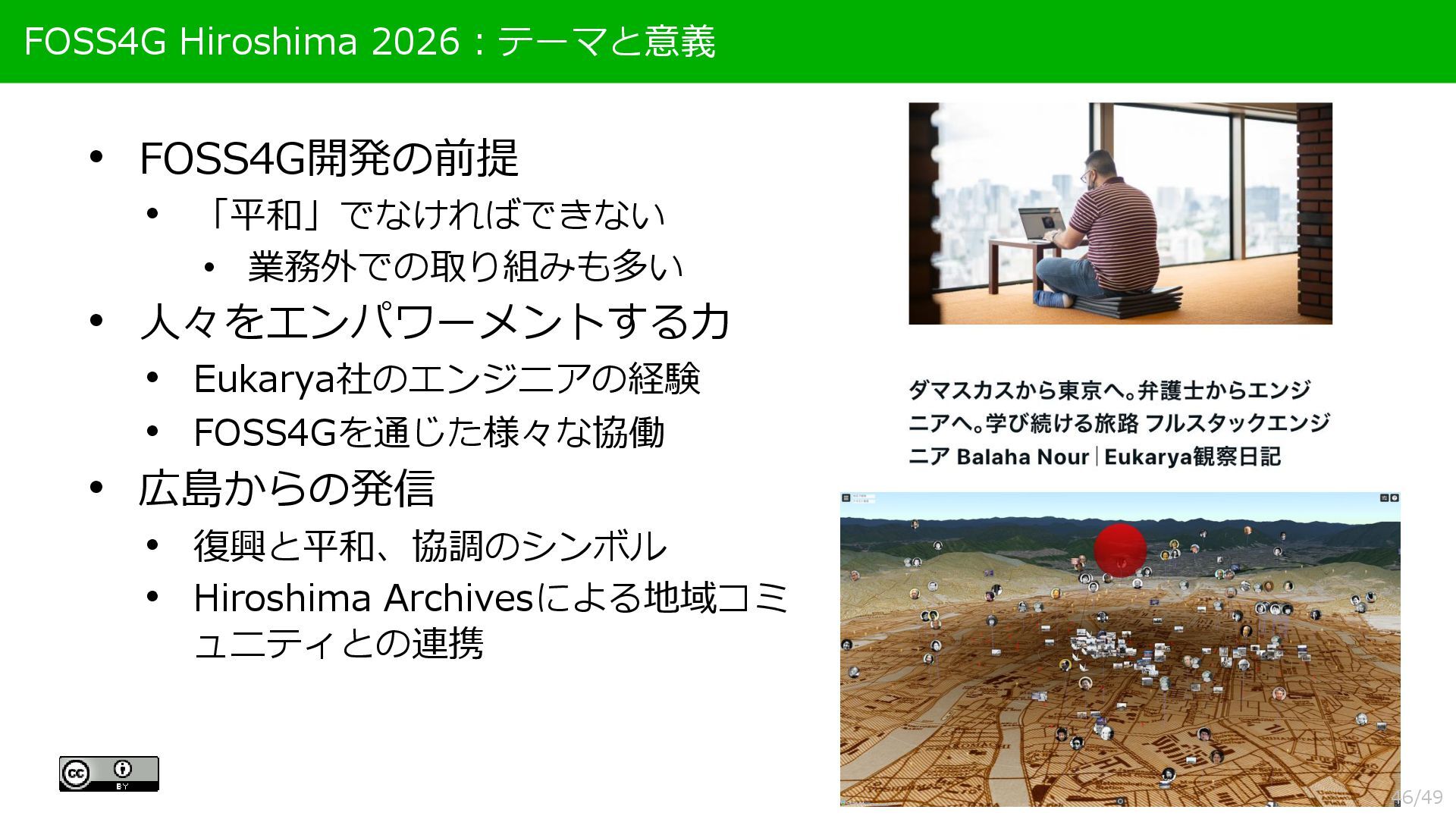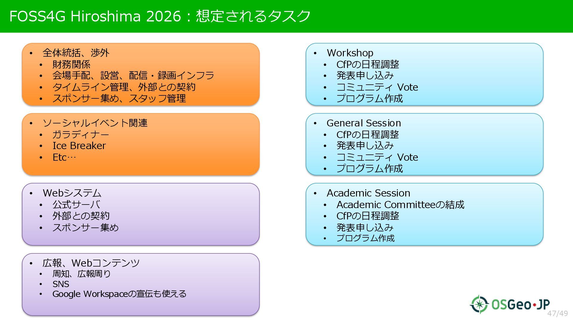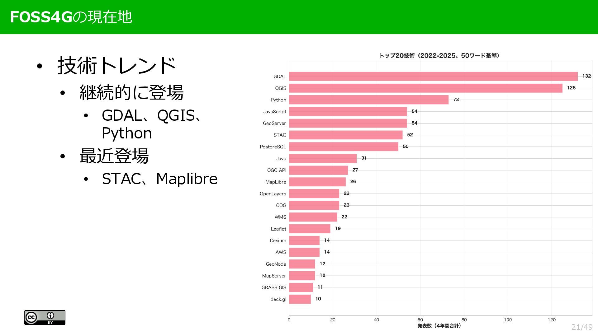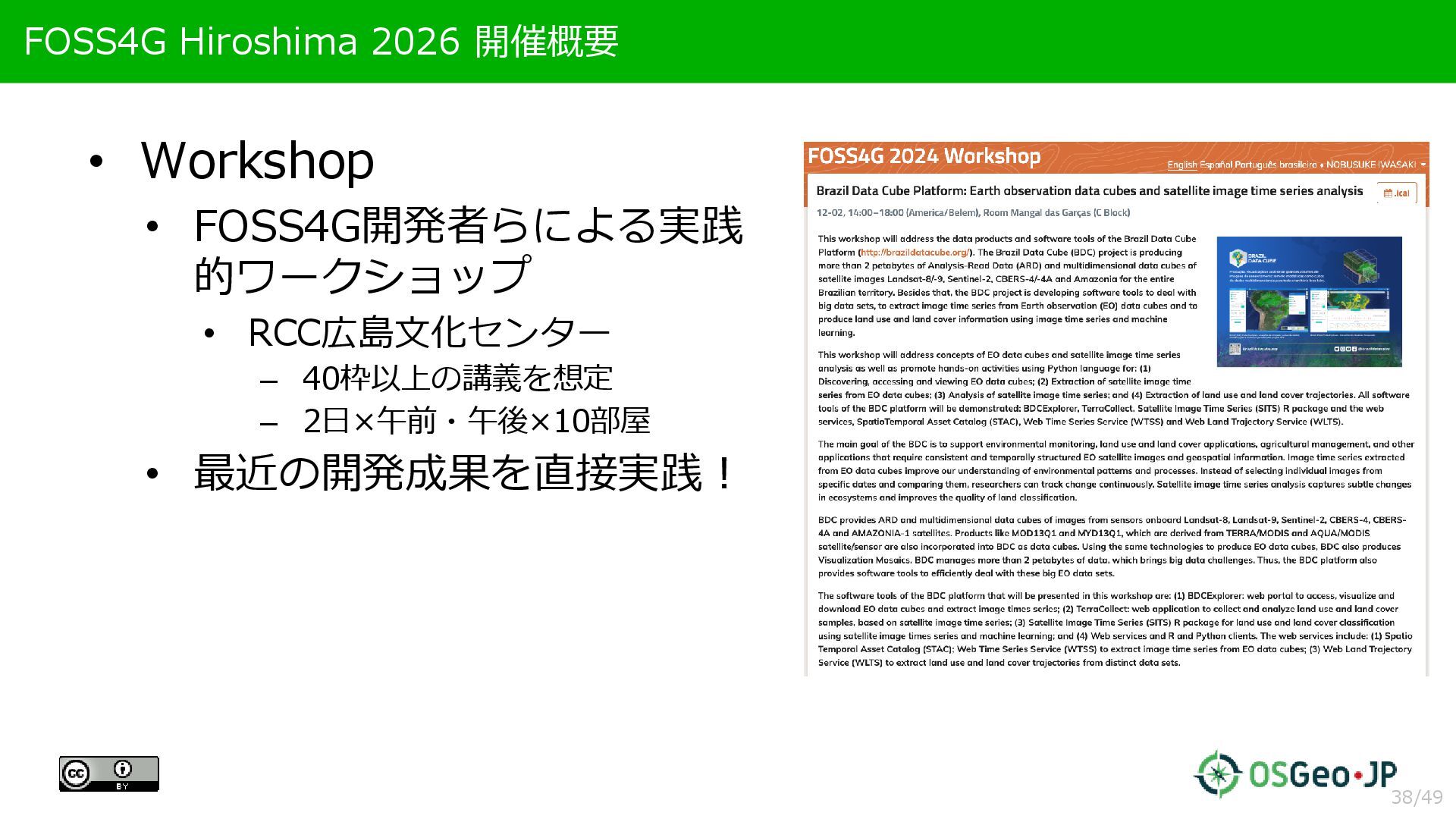 800〜1000語程度のアブス トラクト投稿 – 締め切り後、Scientific Committeeによる審査 – 採択決定通知 • 口頭発表、LT、(ポスター) • Step2 – 期限までにISPRSのテンプレ ートに基づきフルペーパーと して投稿。適合性と剽窃チェ ックし受領 • 会議前後にサイト公開 https://2025.europe.foss4g.org/call-for-proposals/academic-program/ • open hardware • open source software development • open geospatial data • (geo)spatial data sharing systems and big data analysis • GIS for real-time applications, disaster response and recovery • geospatial health informatics • open (geospatial) cloud computing and cybersecurity • open (geo)education • participatory mapping and crowdsourcing • Digital Twins, urban analytics, sustainable urban planning and development • GeoAI and geospatial Machine Learning • Natural Language Processing and Large Language Models • Remote Sensing for water resources management, biodiversity and ecosystem services 30