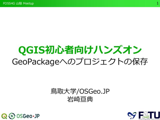 FOSS4G 山陰 Meetup 1 QGIS初心者向けハンズオン GeoPackageへのプロジェクトの保存 鳥取大学/OSGeo.JP 岩崎亘典