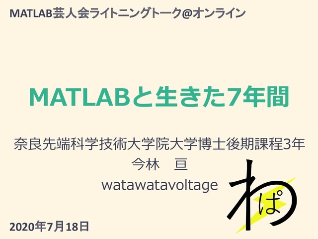 MATLABと生きた7年間 奈良先端科学技術大学院大学博士後期課程3年 今林 亘 watawatavoltage MATLAB芸人会ライトニングトーク@オンライン 2020年7月18日